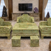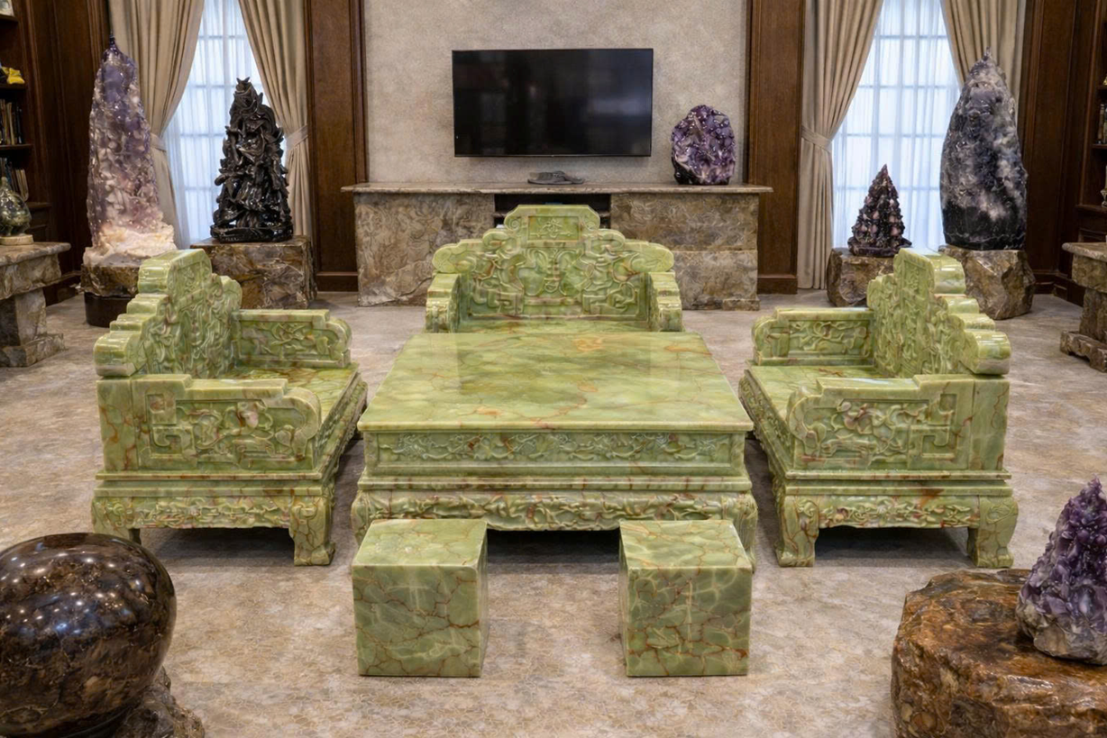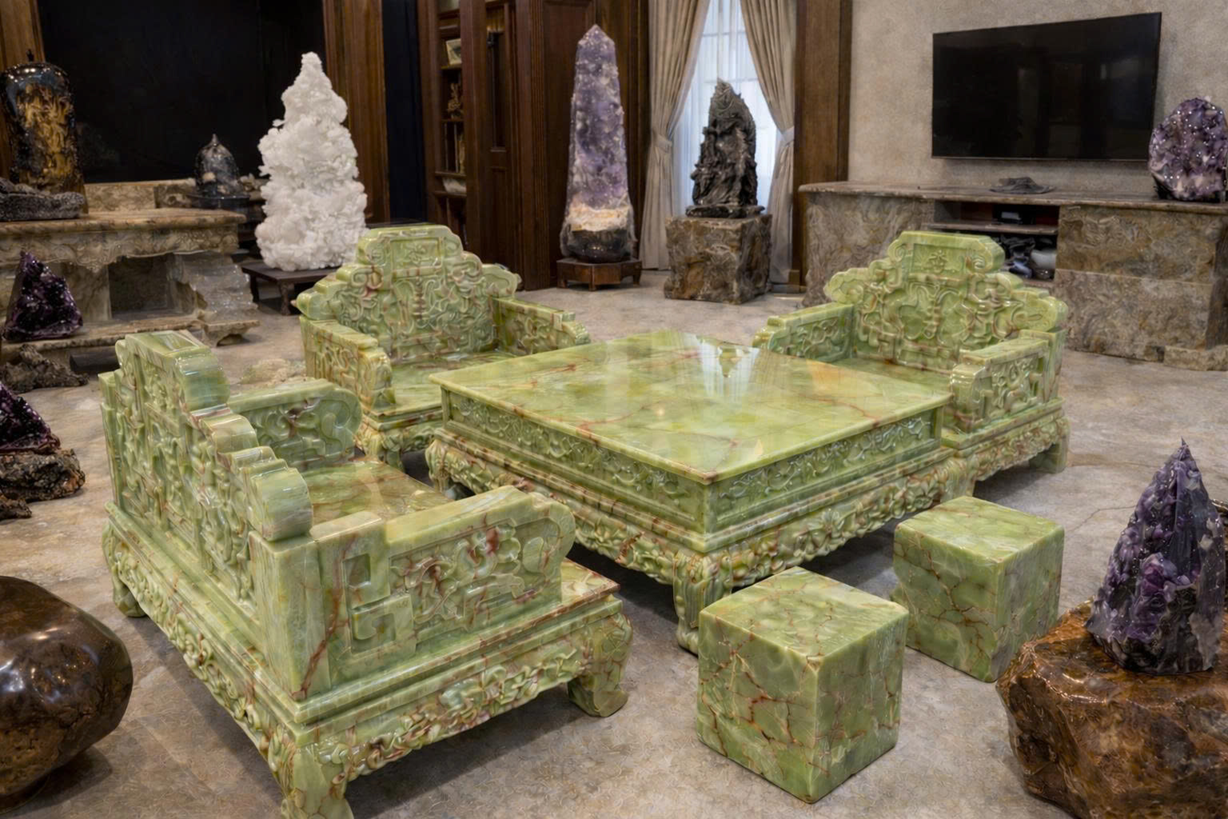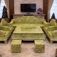 Bộ bàn ghế đá ngọc onix xanh kiệt tác trên nền ngọc tự nhiên.Với kích thước lớn, khối lượng nặng, họa tiết bề thế, bộ bàn ghế bằng ngọc onyx xanh thường được trang hoàng ở Phòng thờ, phòng khách của các lâu đài, biệt phủ, biệt thự, mang lại sự sang trọng, đẳng cấp cho không gian sống.