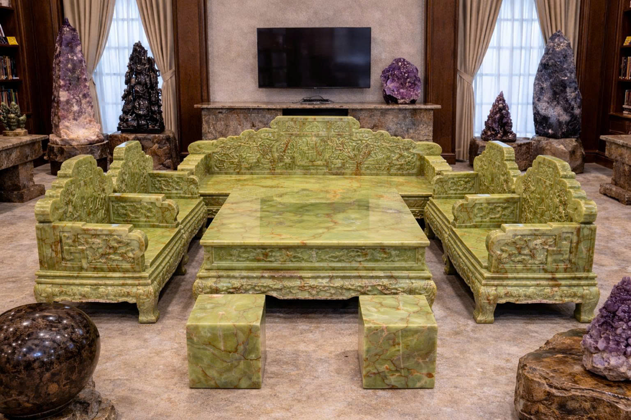 Với kích thước lớn, khối lượng nặng, họa tiết bề thế, bộ bàn ghế bằng ngọc onyx xanh thường được trang hoàng ở Phòng thờ, phòng khách của các lâu đài, biệt phủ, biệt thự, nhà có diện tích rộng mang lại sự sang trọng, đẳng cấp cho không gian sống.
