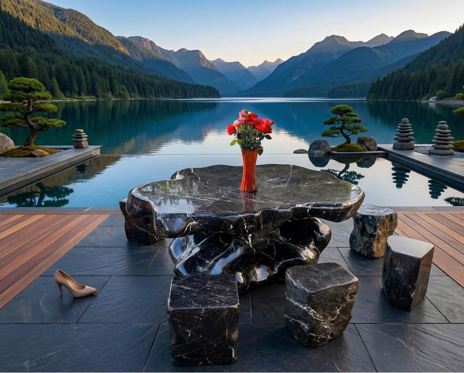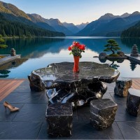 Thiết kế bàn ghế trong ảnh mang phong cách tự nhiên, đặt giữa cảnh núi và hồ nước: