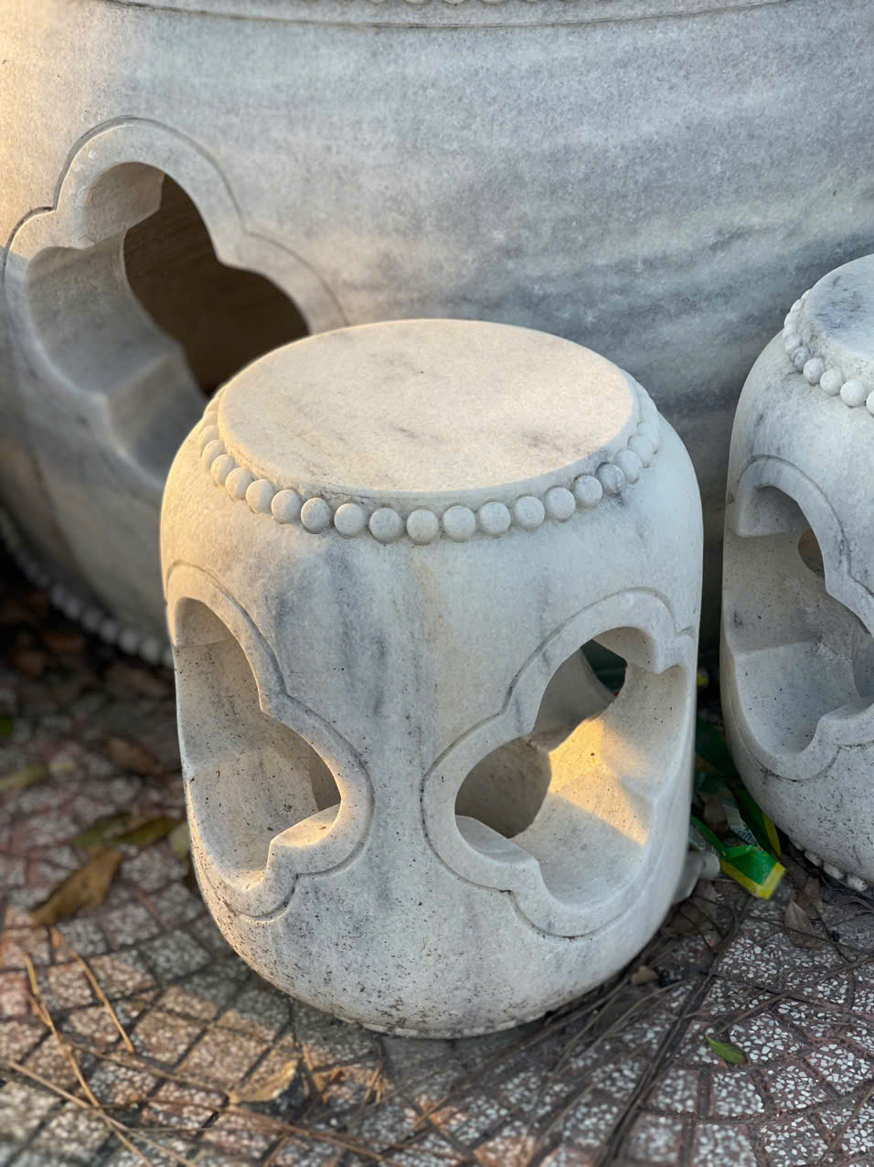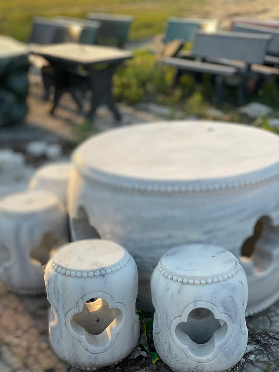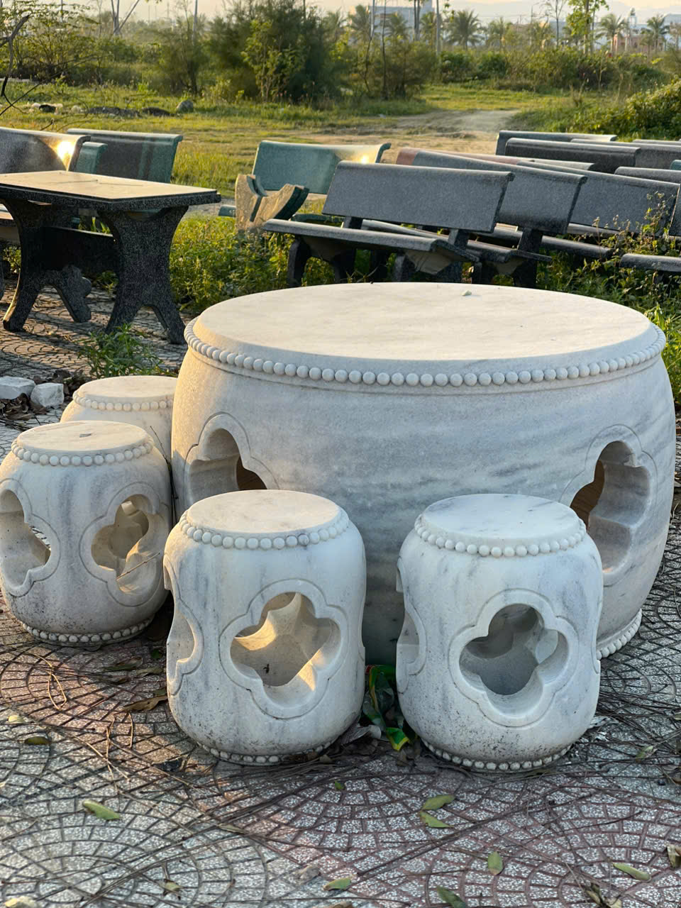 Bộ bàn ghế đá trắng nguyên khối: Bộ bàn gồm 1 bàn và 6 ghế đá trắng nguyên khối, điểm nhấn nổi bật cho không gian sống của bạn.