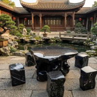 Bàn và ghế được chế tác từ đá khối nguyên tảng, bề mặt đánh bóng cao cấp nên tạo độ phản chiếu rất đẹp.