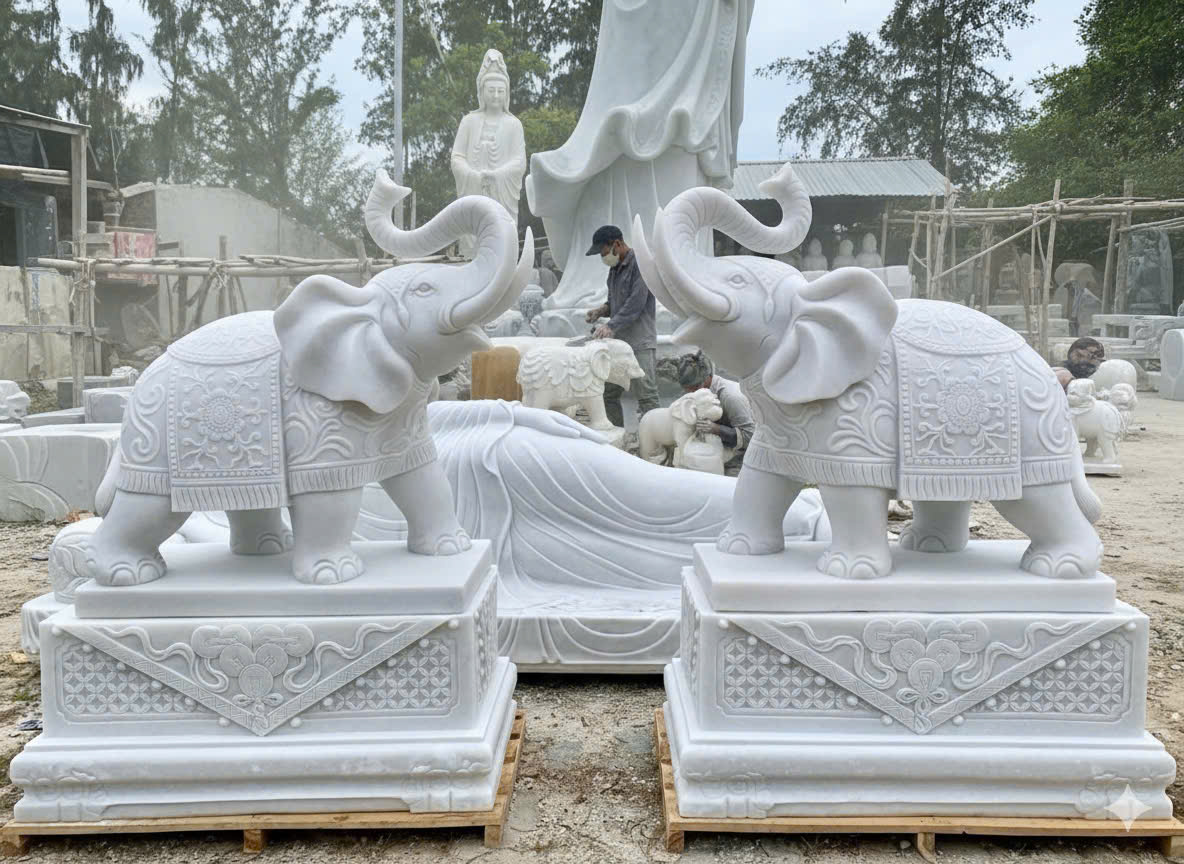 Cặp voi đá trắng (thường là cẩm thạch trắng) mang ý nghĩa phong thủy to lớn về sự thuần khiết, may mắn, và tài lộc. Chúng tượng trưng cho sức mạnh, quyền uy, sự thông minh và trí tuệ, đồng thời trấn trạch bình an, hóa giải tà khí, tăng cường vượng khí cho gia đạo và sự hòa thuận trong gia đình.