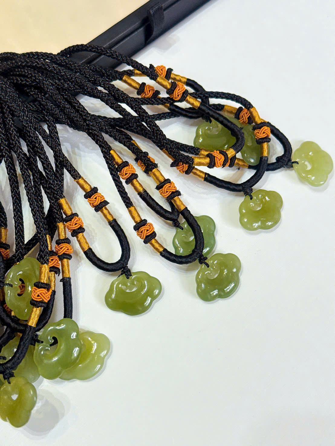Mặt dây chuyền khóa trường mệnh có nguồn gốc từ truyền thống cầu mong bình an, xua đuổi tà ma và bảo vệ sức khỏe. Khi kết hợp với ngọc Hòa Điền, nó giúp đẩy lùi năng lượng tiêu cực, chướng khí và mang lại cảm giác bình yên, an tâm.