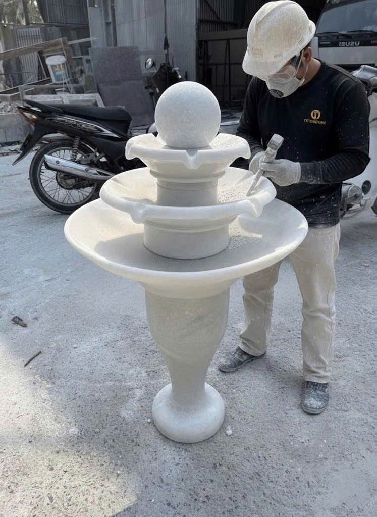 Thủy luân nước bằng đá trắng tự nhiên đang được nghệ nhân chế tác thủ công. Sản phẩm có thiết kế nhiều tầng tròn xếp chồng, phía trên là quả cầu đá tượng trưng cho sự tròn đầy. Khi hoàn thiện, nước sẽ chảy tuần hoàn từ trên xuống các tầng dưới, tạo hiệu ứng mềm mại và sinh động cho không gian.