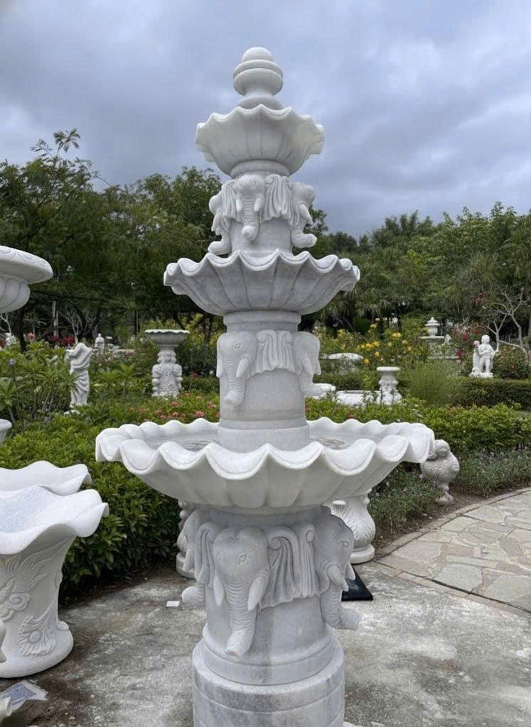 gồm nhiều tầng xếp chồng hài hòa, phần thân được chạm khắc họa tiết đầu voi tinh xảo. Các đường nét mềm mại, cân đối tạo nên tổng thể sang trọng và nổi bật giữa không gian xanh.