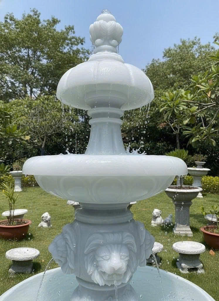 Đài phun gồm nhiều tầng tròn mềm mại ,nước chảy nhẹ nhàng từ trên xuống tạo hiệu ứng sinh động. Phần thân được chạm khắc họa tiết đầu sư tử tinh xảo, kết hợp các đường nét uốn lượn hài hòa, mang lại vẻ sang trọng và nổi bật cho không gian xanh.