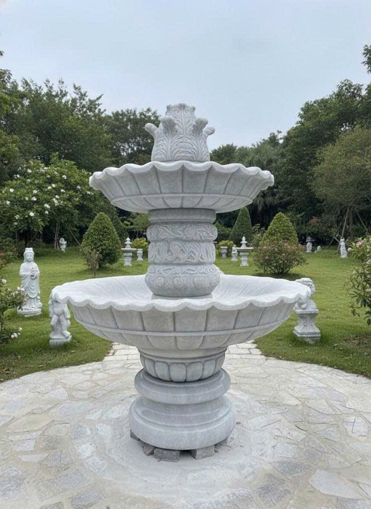 Đài phun nước tượng trưng cho sự lưu thông và sinh khí. Khi đặt trong sân vườn giúp không gian thêm sinh động, tạo cảm giác thư thái và nâng tầm giá trị thẩm mỹ cho công trình.