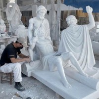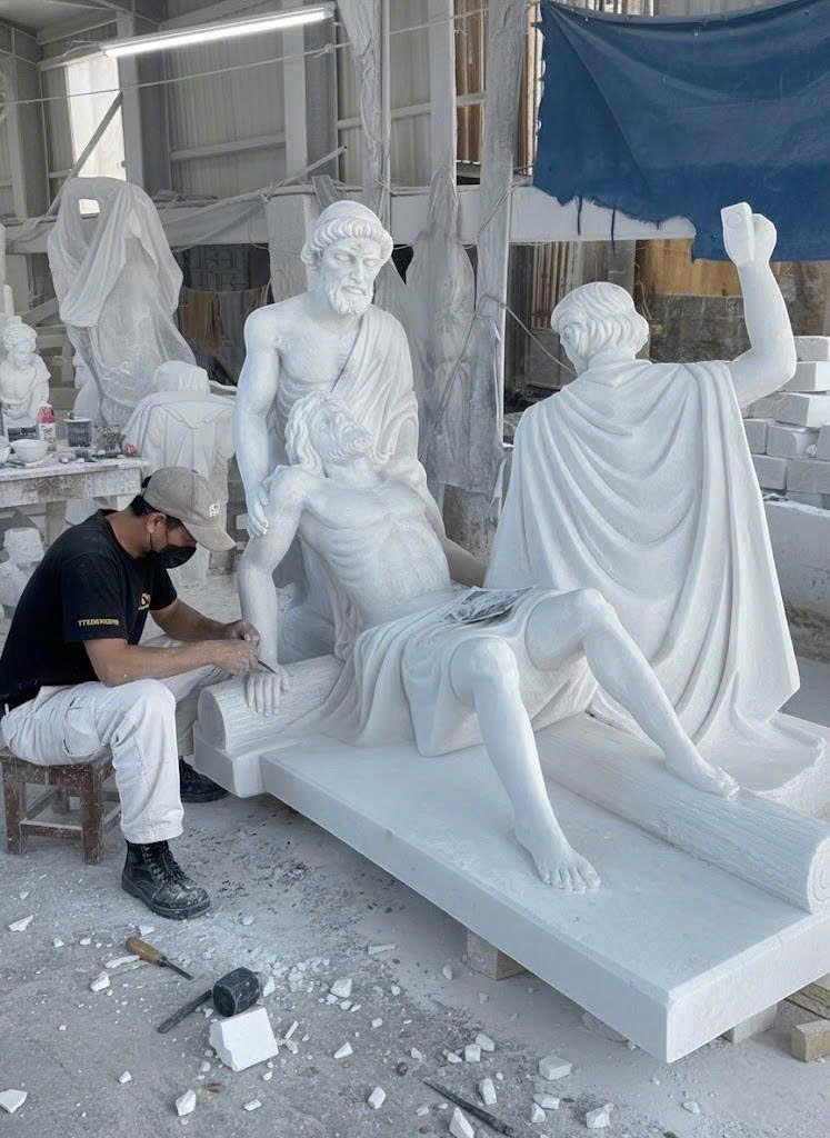 Tượng đá trắng tái hiện cảnh Chúa Giêsu chịu đóng đinh và được hạ xuống khỏi thập giá, đang trong quá trình hoàn thiện tại xưởng điêu khắc. Tác phẩm được chế tác từ đá trắng nguyên khối, quy mô lớn, các nhân vật được thể hiện sống động và giàu cảm xúc.