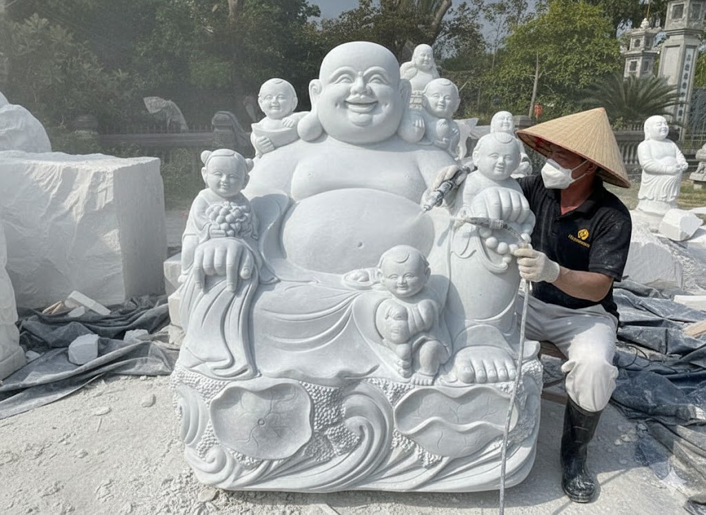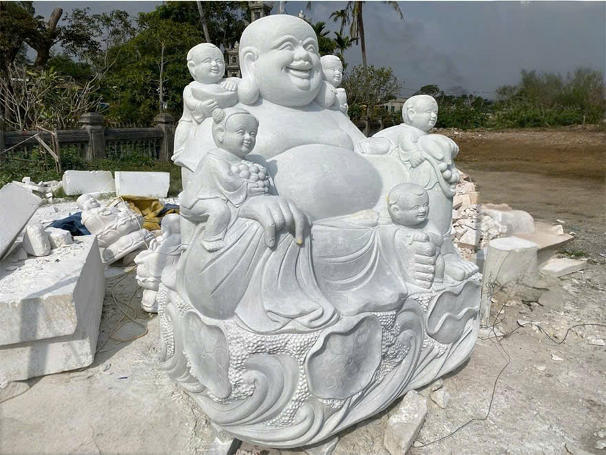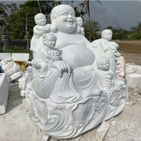Tượng đá mỹ nghệ Phật Di Lặc ngồi cùng 5 tiểu đồng bằng đá trắng nguyên khối, ngài ngồi uy nghi trên đài sen, gương mặt nở nụ cười hoan hỷ, bao quanh là 5 tiểu đồng hồn nhiên, vui tươi tượng trưng cho phúc lộc đầy nhà.