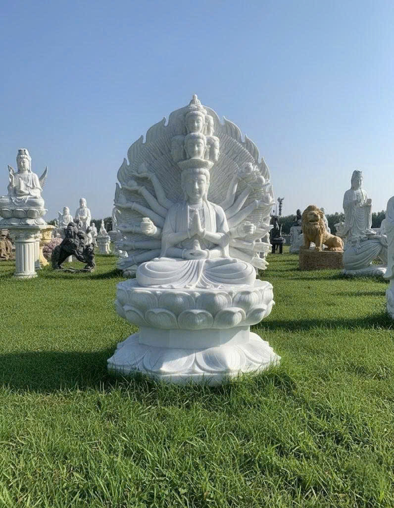 Tượng đá trắng Phật Quan Thế Âm Bồ Tát nghìn tay, nghìn mắt ngồi trên đài sen