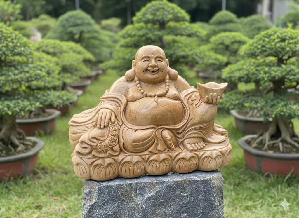 Bức tượng này là biểu tượng của sự Hạnh Phúc viên mãn kết hợp với Tài Lộc dồi dào. Đặt tượng Di Lặc cầm vàng trong nhà (đặc biệt là hướng về phía cửa chính hoặc trong khu vực tài lộc) được tin là sẽ thu hút may mắn, tiền tài, và giữ cho gia đình luôn vui vẻ, hòa thuận.