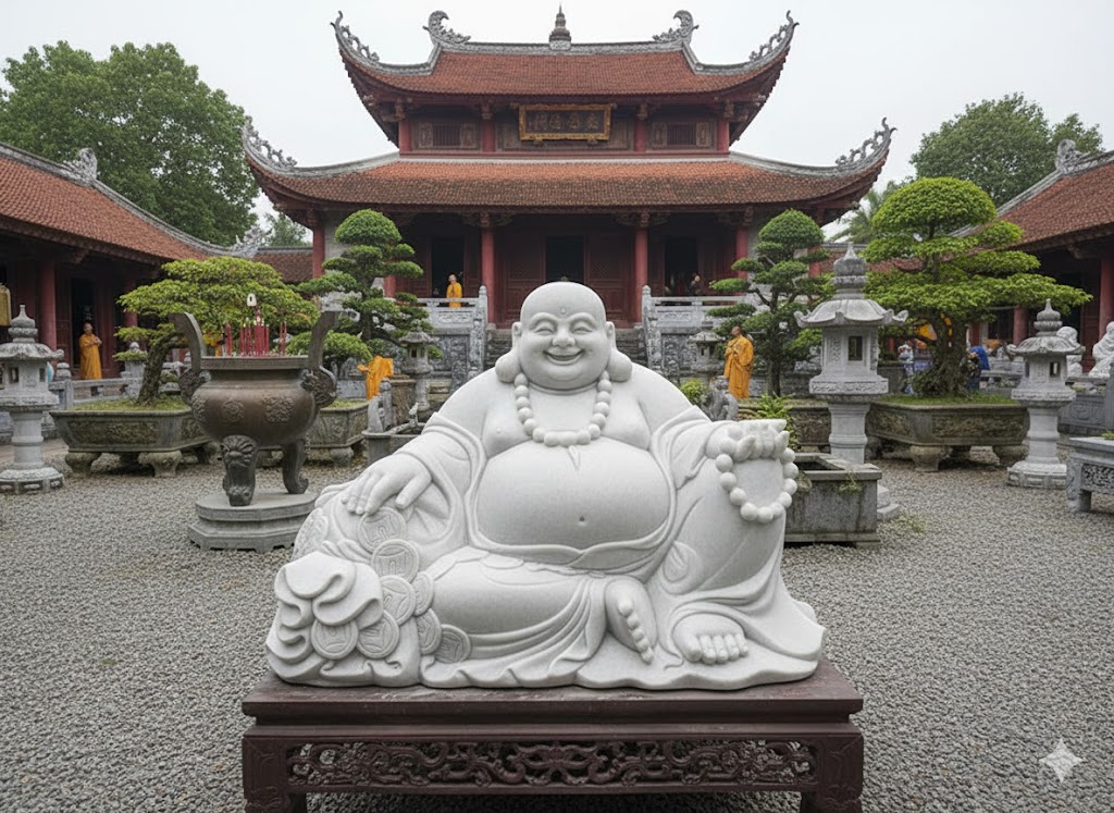 Bụng to tượng trưng cho lòng bao dung, chứa đựng và hóa giải mọi phiền muộn.