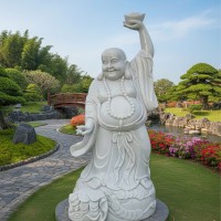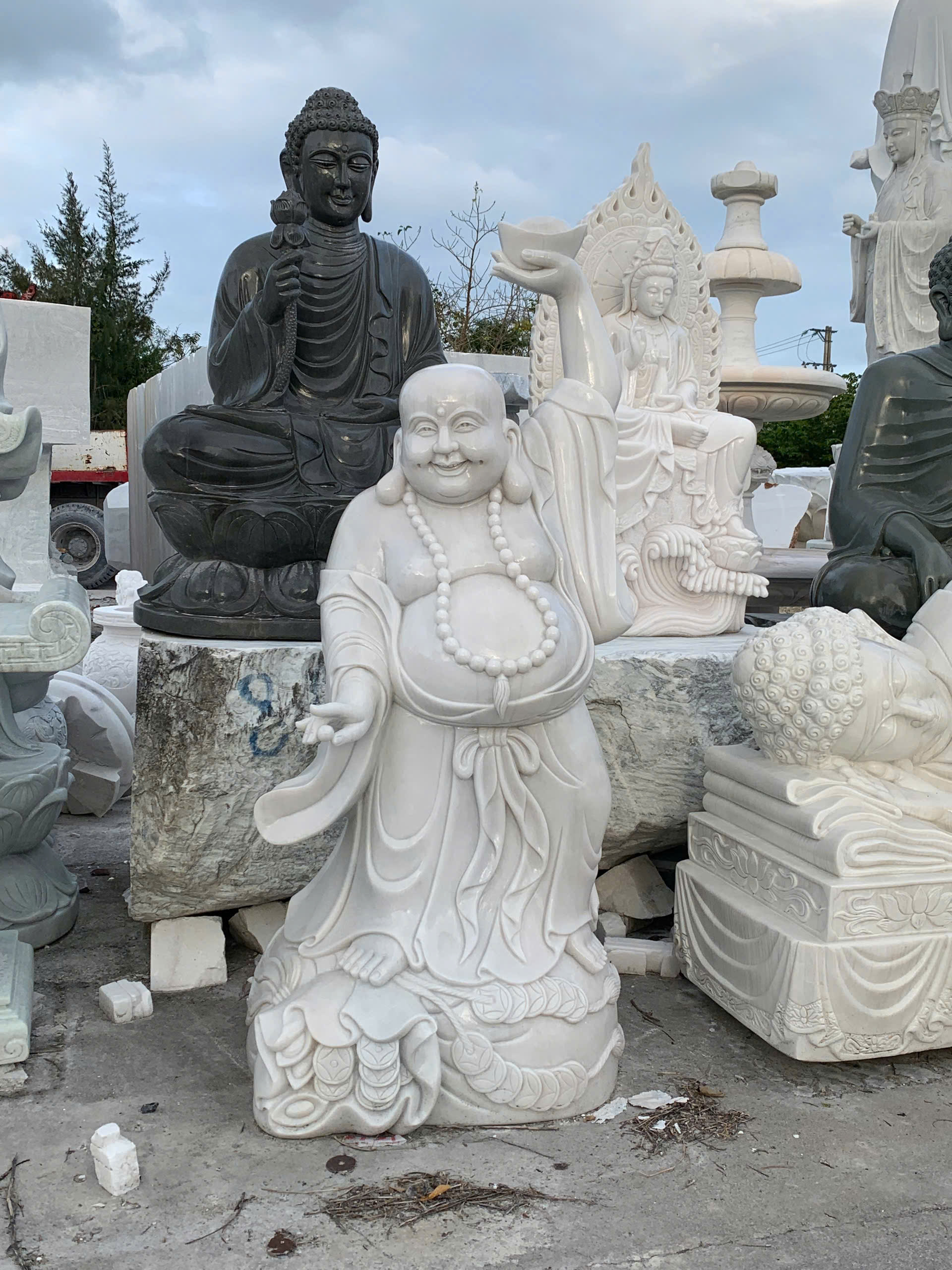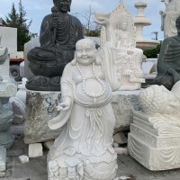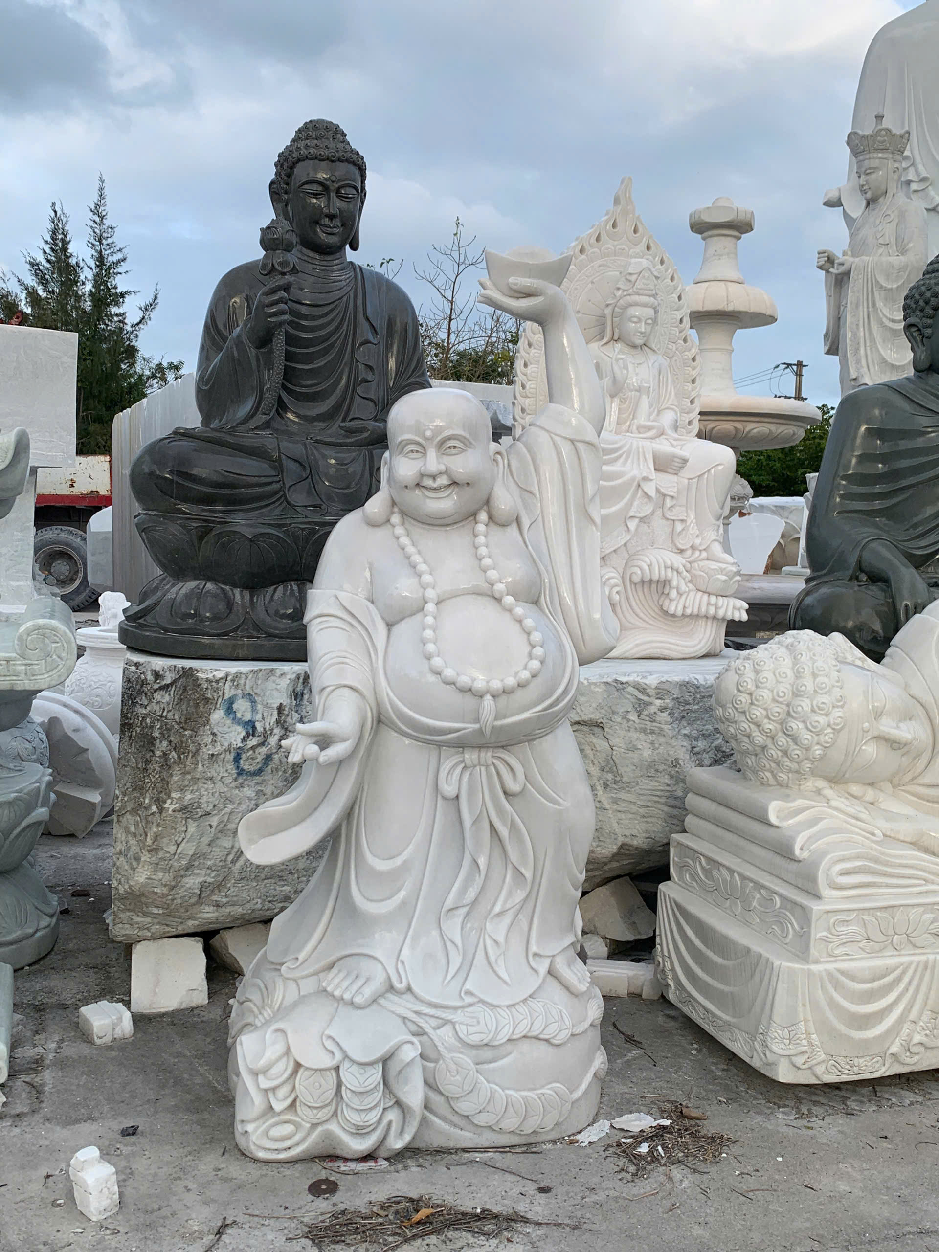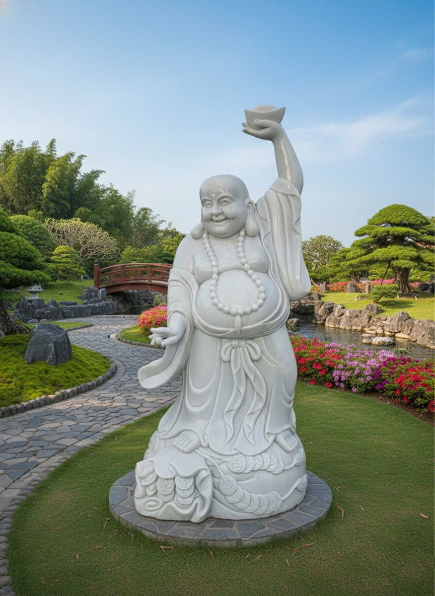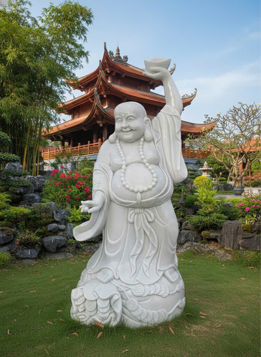 Tượng Di Lặc đứng bằng đá trắng tượng trưng cho sự thuần khiết, an lạc, hạnh phúc viên mãn và tài lộc thịnh vượng. Màu đá trắng mang ý nghĩa tinh khiết, thanh cao, giúp thanh lọc năng lượng, giảm stress, trong khi tư thế đứng thể hiện sự sẵn sàng mang phúc khí, niềm vui đến cho gia chủ, rất phù hợp cho không gian sang trọng, tôn nghiêm.