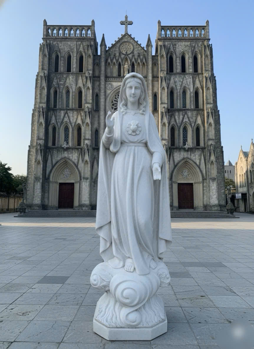 Tượng Đức Mẹ Fatima bằng đá trắng thường có hình ảnh hiền từ, mặc áo choàng trắng, là điểm tựa tinh thần vững chắc cho tín đồ Công giáo.