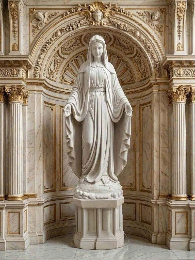 Chất liệu đá trắng nguyên khối với bề mặt mịn, đường nét chạm khắc mềm mại, đặc biệt là các nếp áo được thể hiện rất sống động và chân thực. Phía sau là phần vòm kiến trúc được trang trí cầu kỳ với hoa văn, phù điêu tinh xảo, làm nổi bật sự trang nghiêm và linh thiêng của bức tượng