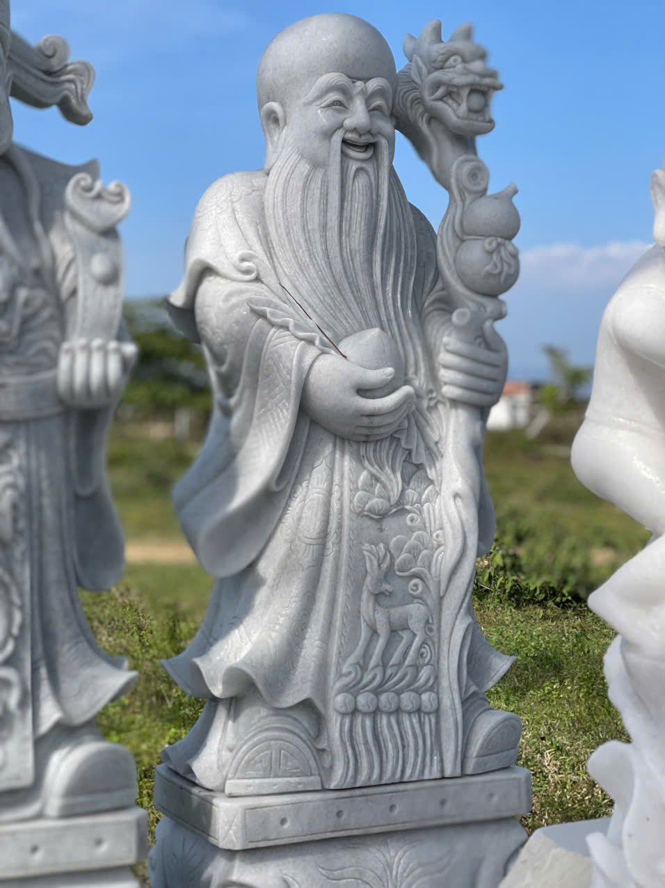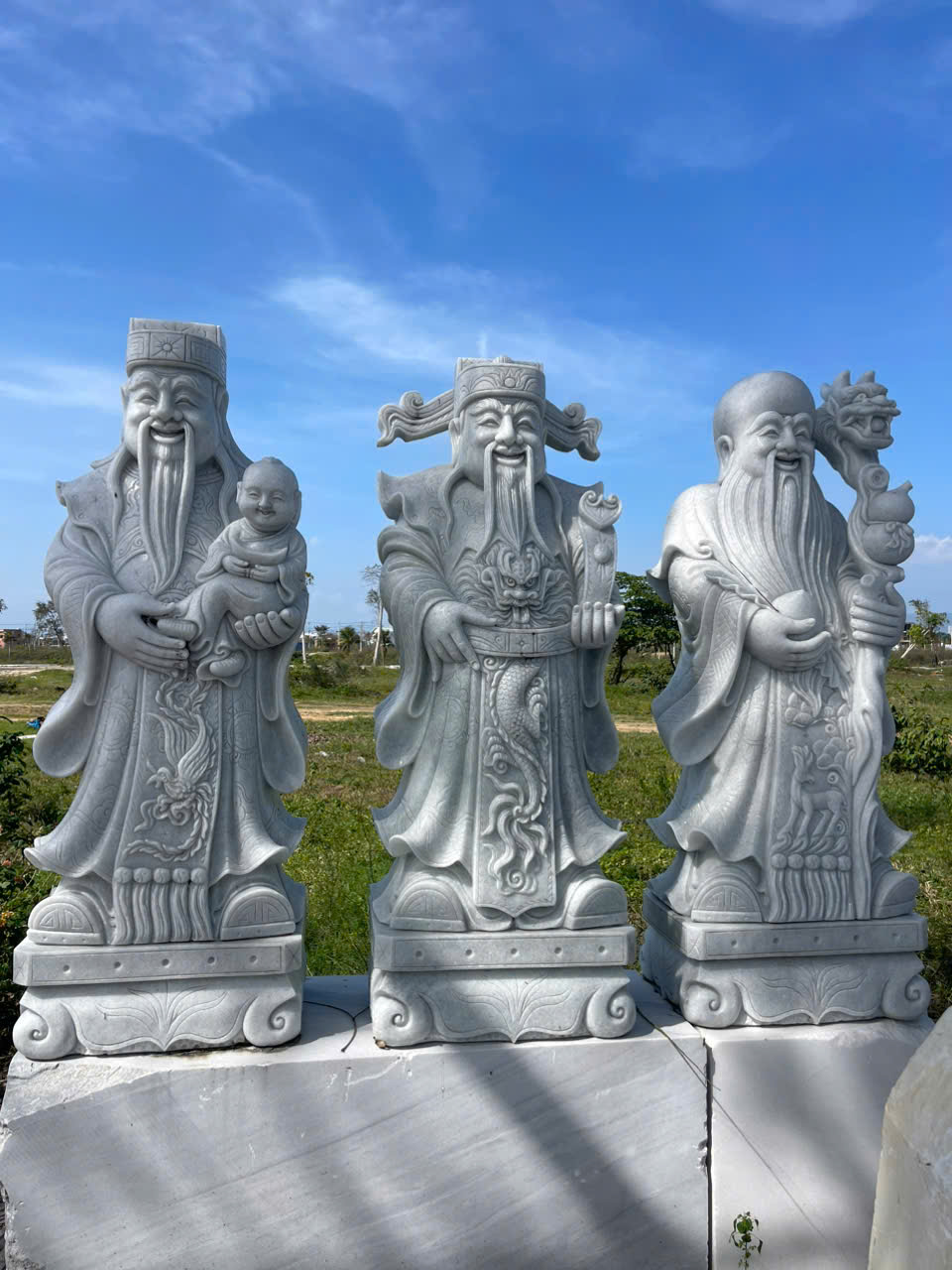 Tượng điêu khắc ba ông tam đa đá trắng xanh nguyên khối : sẽ mang lại không khí vui vẻ cũng như vượng khí rất tốt cho gia đình.