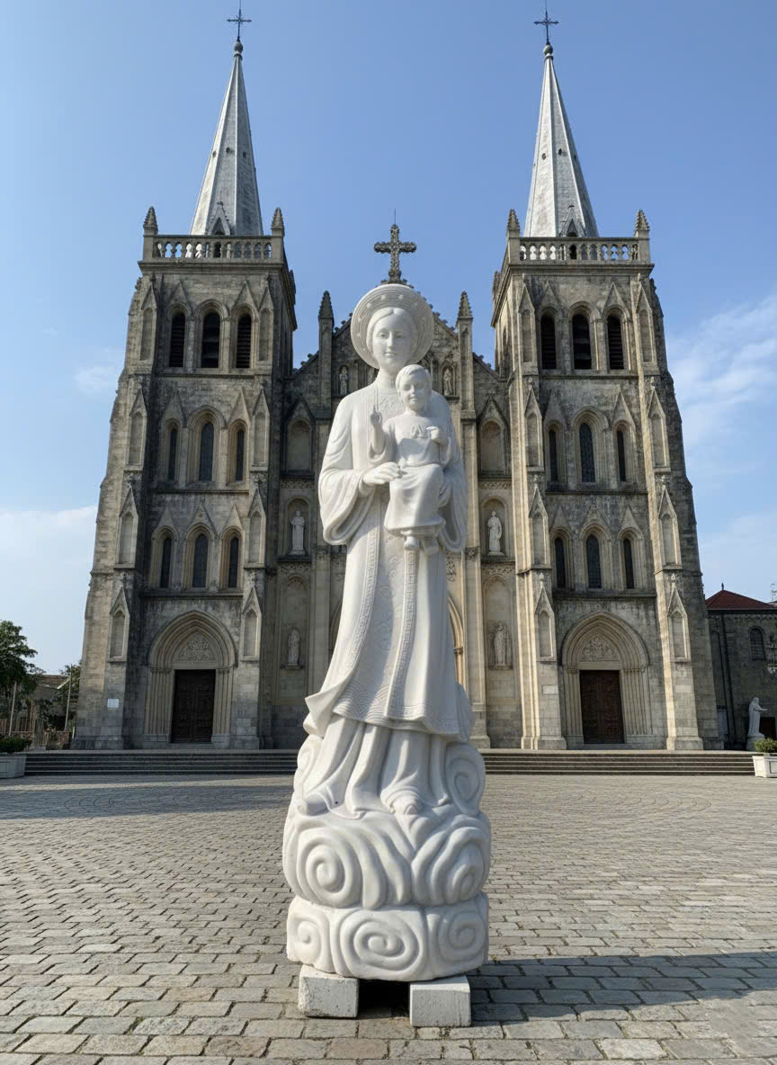 Vẻ đẹp tinh khiết (Đá trắng): Chất liệu đá trắng tự nhiên nguyên khối thể hiện sự tôn kính, trang nghiêm, thanh tao và bền vững của đức tin qua thời gian.