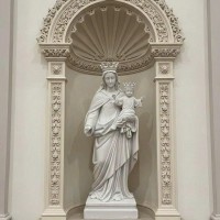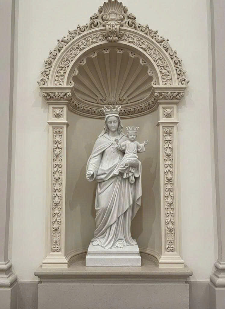 Tượng Đức Mẹ Maria bồng Chúa Giêsu hài đồng bằng đá trắng nguyên khối, với gương mặt Đức Mẹ hiền từ, ánh nhìn dịu dàng và đầy yêu thương. Chúa Hài Đồng cũng đội vương miện, một tay giơ lên như ban phúc lành. Các nếp áo được chạm khắc mềm mại, uyển chuyển.