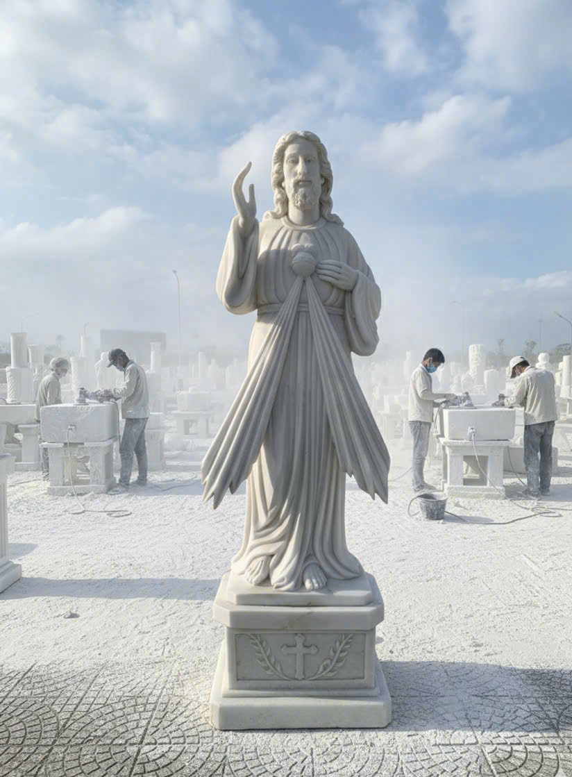 Biểu tượng của Lòng Thương Xót và Tha Thứ: Tượng khắc họa Chúa Giêsu bước tới, tay phải ban phước và tay trái chỉ vào trái tim đang rực cháy, thể hiện sự đón nhận tất cả mọi người, kể cả những người tội lỗi.