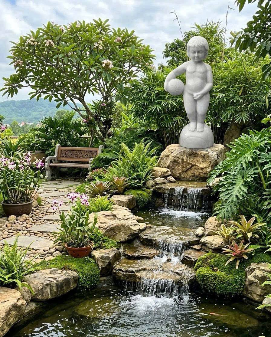 • Hình khối sống động: Bức tượng tạc từ đá trắng nguyên khối, giữ trọn vẻ tinh khôi. Hình ảnh chú bé cầm quả bóng không chỉ là nét hiện đại mà còn tượng trưng cho sự tròn đầy, viên mãn và tinh thần thể thao năng động.