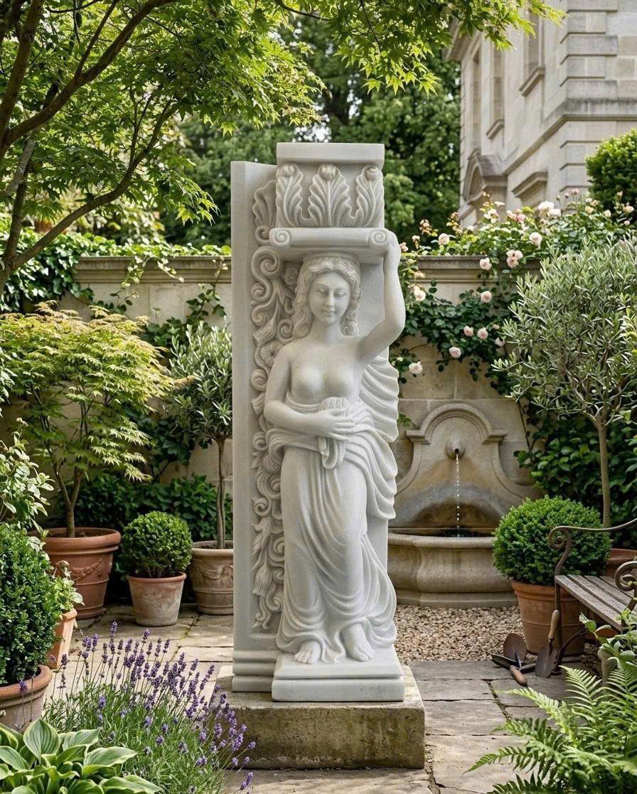 • Đẳng Cấp Cổ Điển: Việc sở hữu một bức tượng Caryatid tạc từ đá trắng nguyên khối là minh chứng cho gu thẩm mỹ hoàng gia và sự sang trọng, bởi đây là phong cách thường thấy ở các đền đài cổ hoặc các cung điện lớn tại Châu Âu.