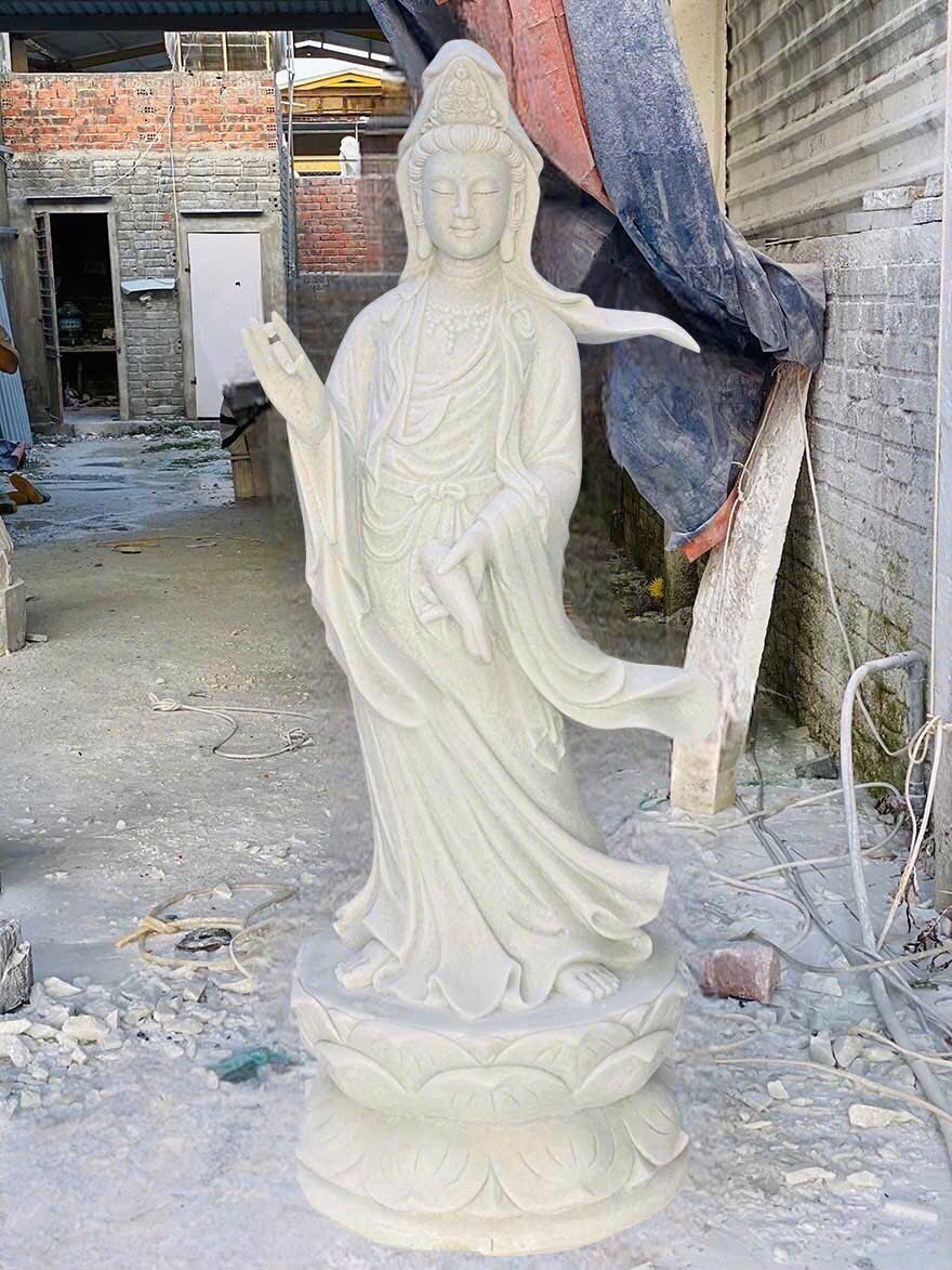 • Tượng phật bà quan âm đá trắng nguyên khối cao 1.5m T3694