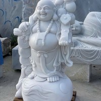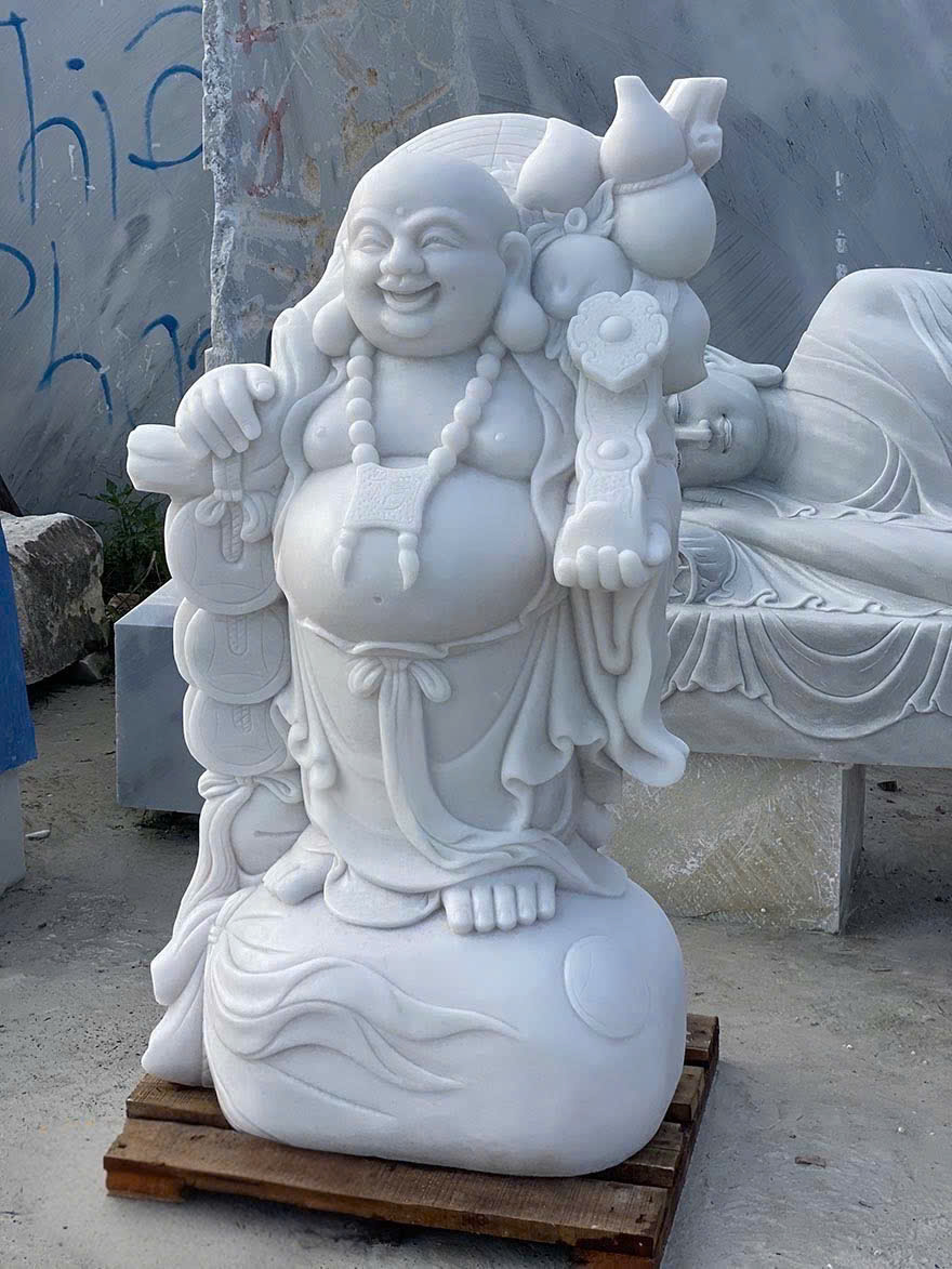Tượng phật di lặc gánh tiền bằng đá trắng trên vai gánh bao tiền nặng trĩu, biểu trưng cho tài lộc dồi dào, còn chiếc hồ lô là biểu tượng của trường thọ và bình an.