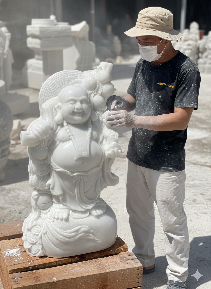 Tượng phật di lặc vác cành đào bằng đá trắng với gương mặt hiền hậu, nụ cười rạng rỡ, bụng căng tròn biểu trưng cho sự sung túc và vác trên vai cành đào kết trái sum suê, tượng trưng cho sự trường thọ, may mắn và phú quý.