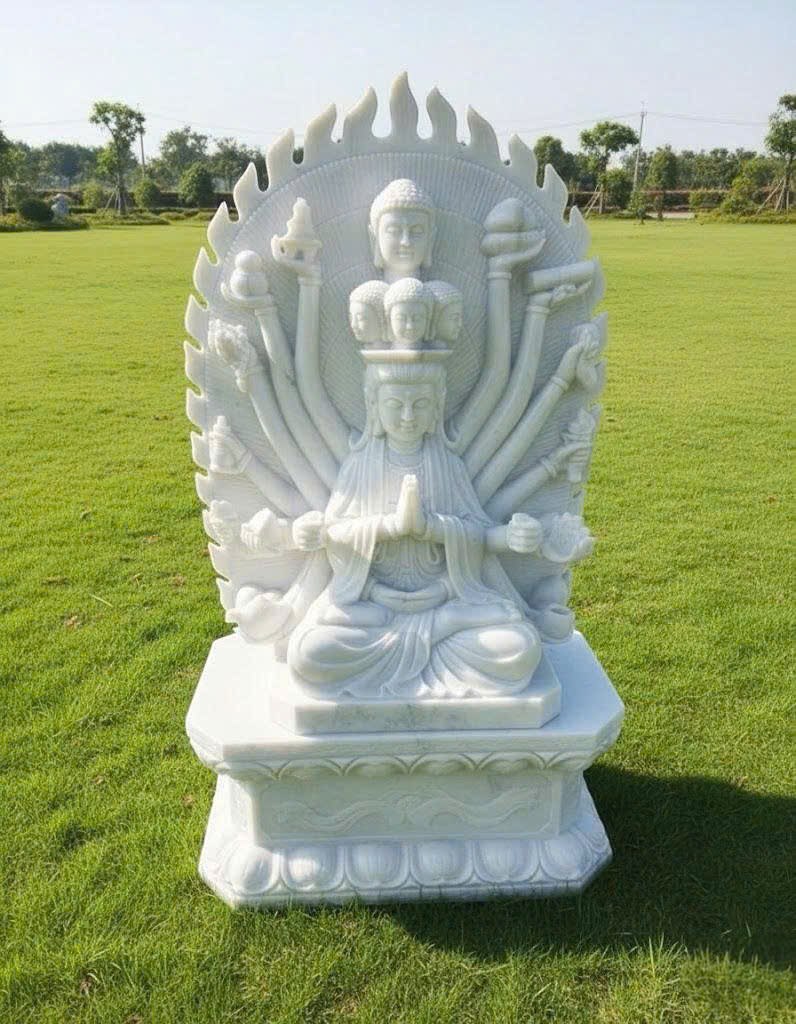 Tượng Phật Quan Âm Thiên Thủ Thiên Nhãn ngồi trên đài sen bằng đá trắng