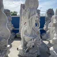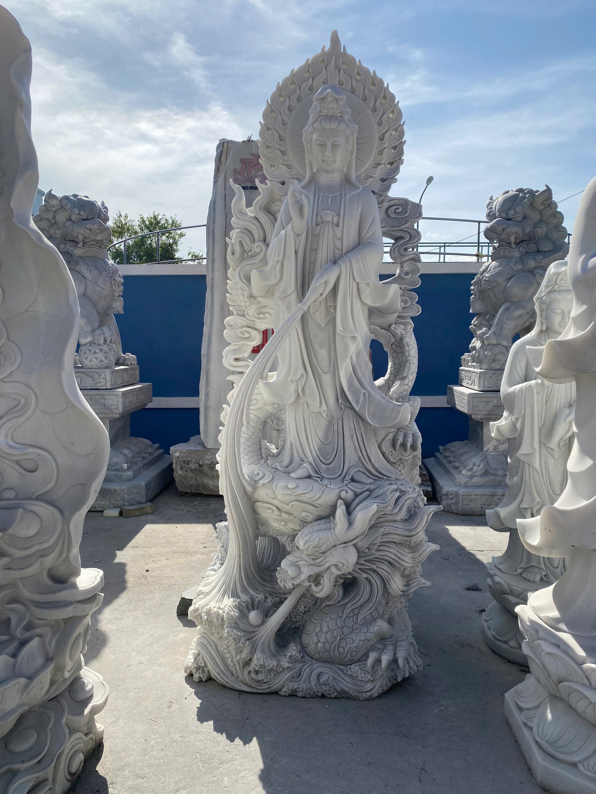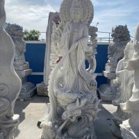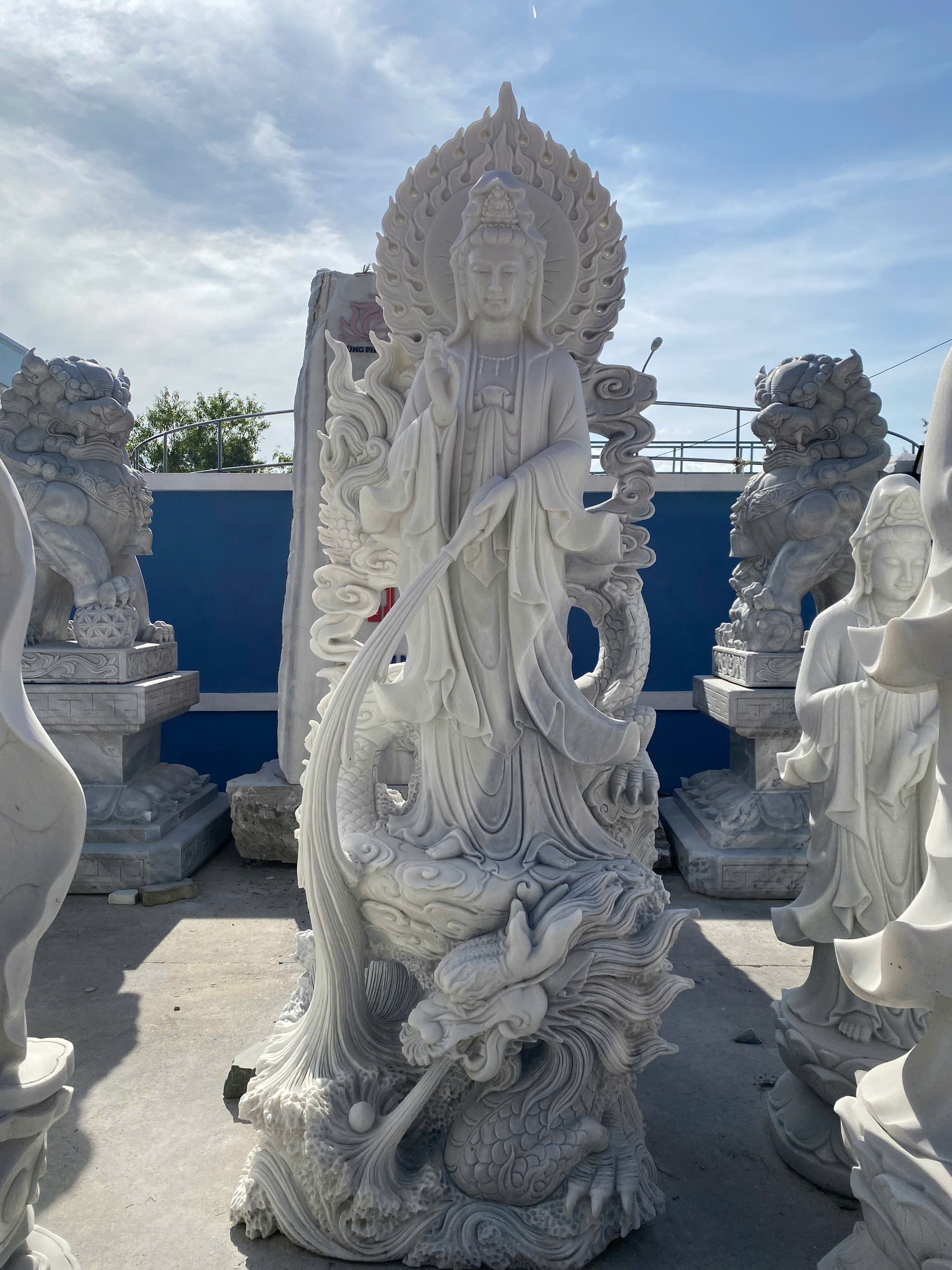 • Tượng phật Quan Thế Âm Bồ tát cưỡi rồng đá trắng nguyên khối cao 2.5m ngang 90cm dài 65cm T3596