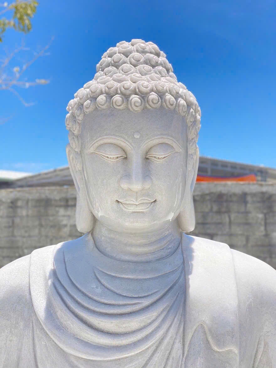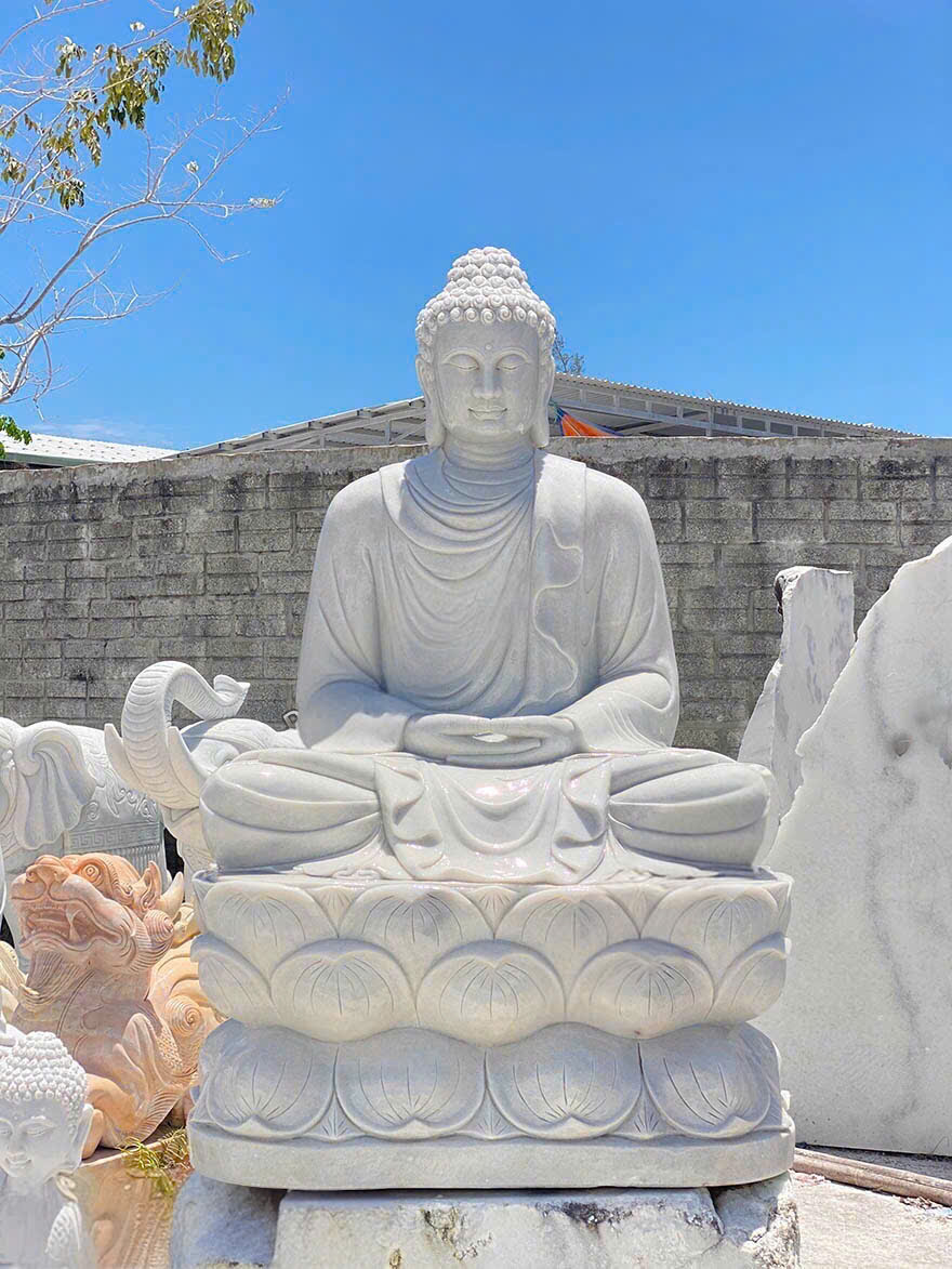 Tượng Phật thích ca ngồi được chế tác tinh xảo từ đá trắng nguyên khối tự nhiên, mang sắc trắng thuần khiết, biểu trưng cho sự thanh tịnh và giác ngộ. Từng đường nét chạm khắc trên khuôn mặt, nếp áo và hoa sen đều được nghệ nhân thực hiện tỉ mỉ bằng tay, thể hiện thần thái từ bi, an nhiên và trí tuệ của Đức Phật.