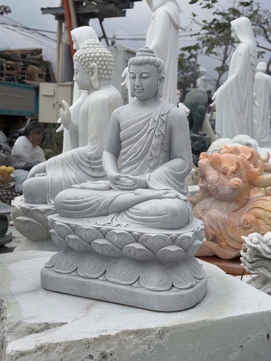 Tượng Phật THÍCH CA ngồi được chế tác tinh xảo từ đá trắng nguyên khối tự nhiên, mang sắc trắng thuần khiết, biểu trưng cho sự thanh tịnh và giác ngộ. Từng đường nét chạm khắc trên khuôn mặt, nếp áo và hoa sen đều được nghệ nhân thực hiện tỉ mỉ bằng tay, thể hiện thần thái từ bi, an nhiên và trí tuệ của Đức Phật.