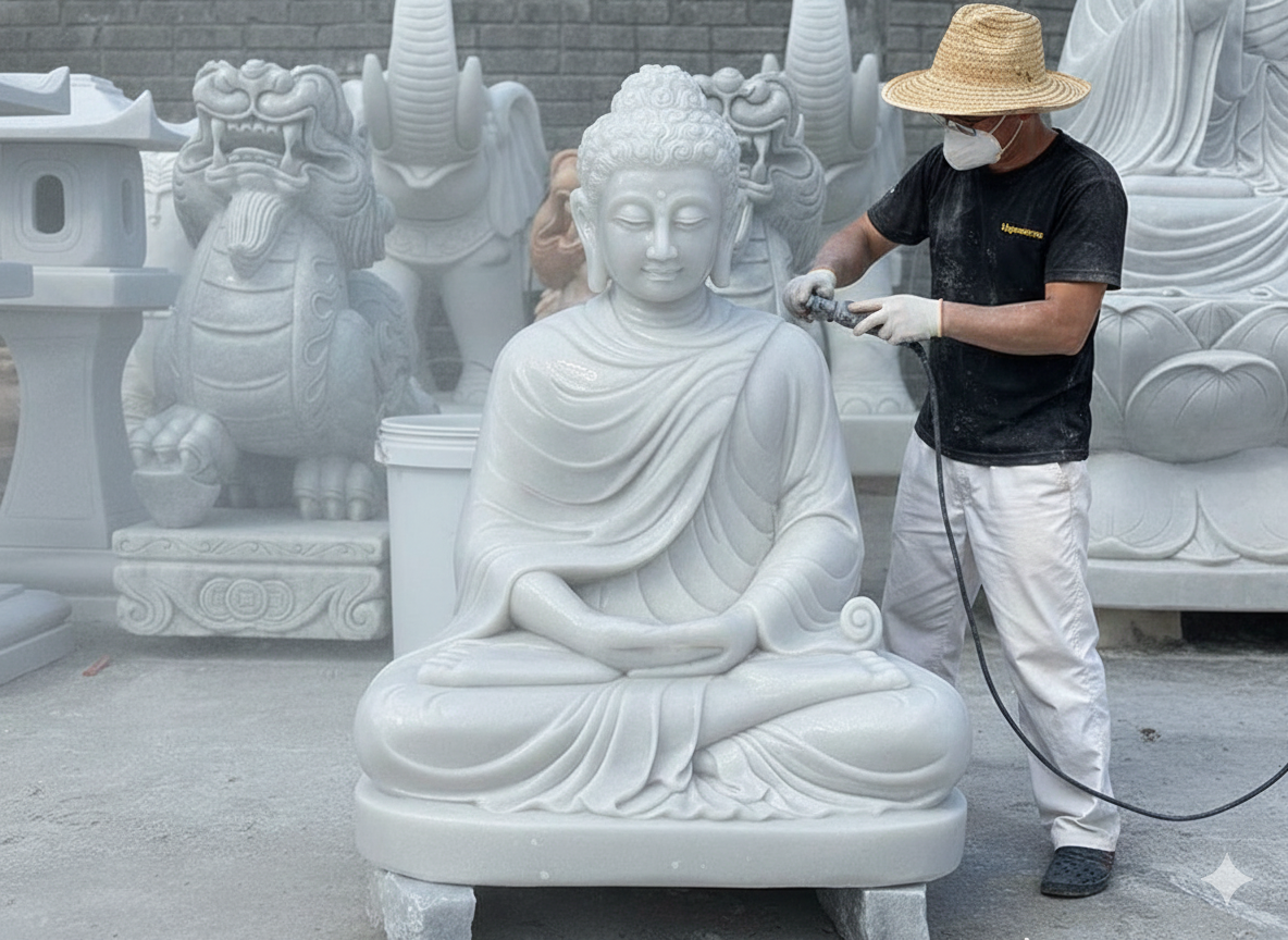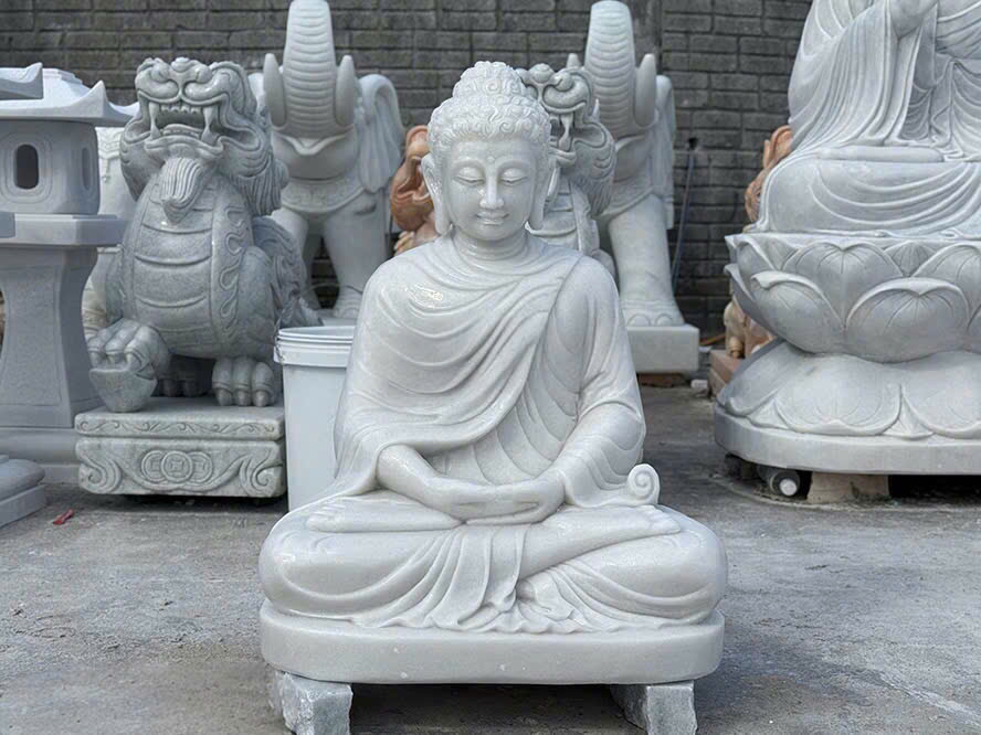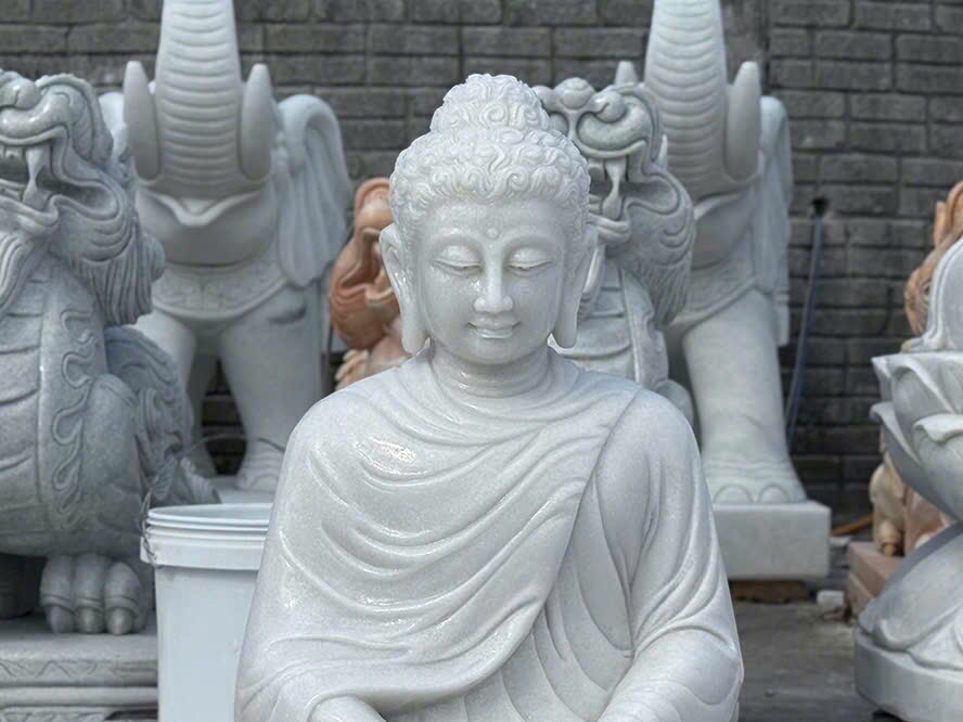 Tượng PhẬT THÍCH CA ngồi được chế tác tinh xảo từ đá trắng nguyên khối tự nhiên.biểu trưng cho sự thanh tịnh và giác ngộ. thể hiện thần thái từ bi, an nhiên và trí tuệ của Đức Phật