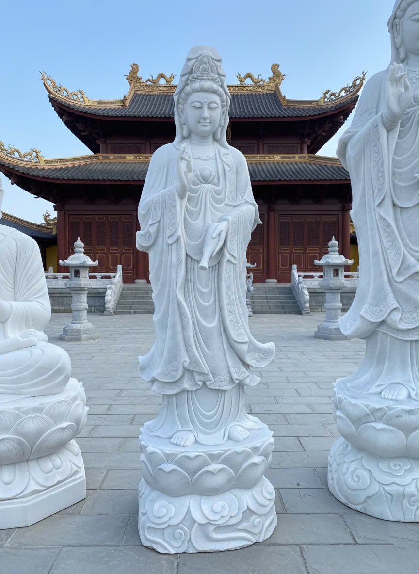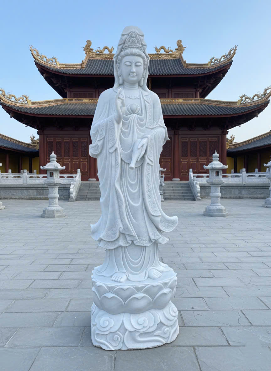 Tượng Quan Âm bằng đá trắng, đặc biệt là đá trắng tự nhiên, được xem là một trong những loại tượng mang lại sự an lạc và tôn kính cao, phổ biến tại các chùa chiền và gia đình.