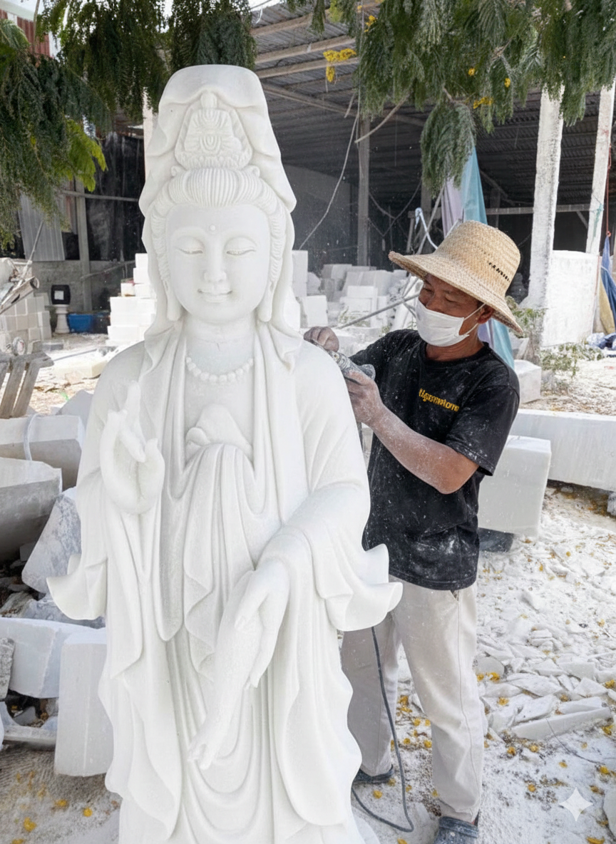 +Tư thế đứng thể hiện sự chủ động cứu độ, sẵn sàng đến mọi nơi để giúp đỡ con người. Nhiều người tin rằng tượng Quan Âm đứng giúp xua tan tà khí, mang lại bình an và may mắn.