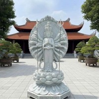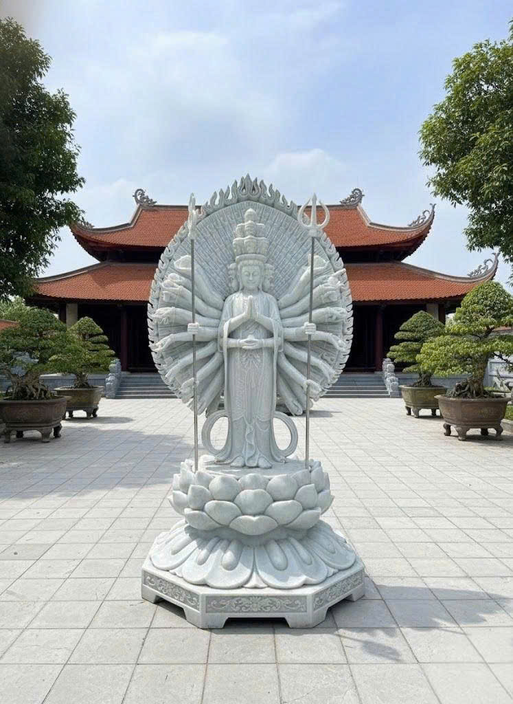 Đây là tượng Quan Âm Thiên Thủ Thiên Nhãn (Quan Thế Âm Bồ Tát nghìn tay nghìn mắt), được chế tác từ đá trắng tự nhiên nguyên khối. ượng Quan Thế Âm Bồ Tát Thiên Thủ Thiên Nhãn được chế tác từ đá trắng tự nhiên nguyên khối, nổi bật với đường nét điêu khắc tinh xảo và thần thái trang nghiêm. Hình tượng nghìn tay nghìn mắt thể hiện lòng từ bi rộng lớn và trí tuệ sáng suốt. Tượng đứng trên đài sen vững chãi, tạo cảm giác thanh tịnh, an yên cho không gian sân vườn, chùa chiền hoặc khuôn viên tâm linh. Đây không chỉ là tác phẩm nghệ thuật giá trị mà còn là điểm nhấn trang trọng, nâng tầm vẻ đẹp tổng thể công trình.