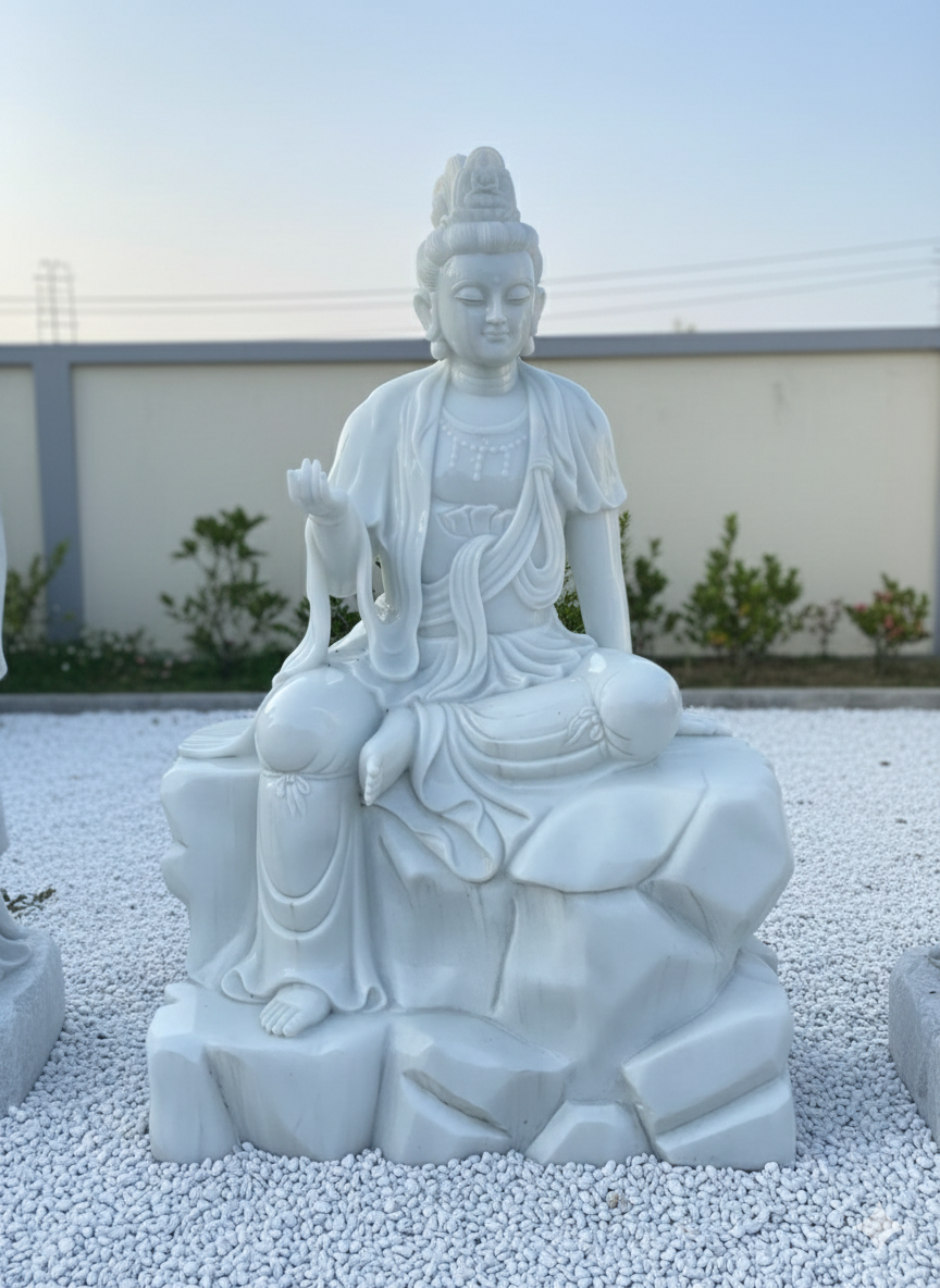 Tượng quan âm đá trắng nguyên khối mang lại sự bình an may mắn cho gia chủ