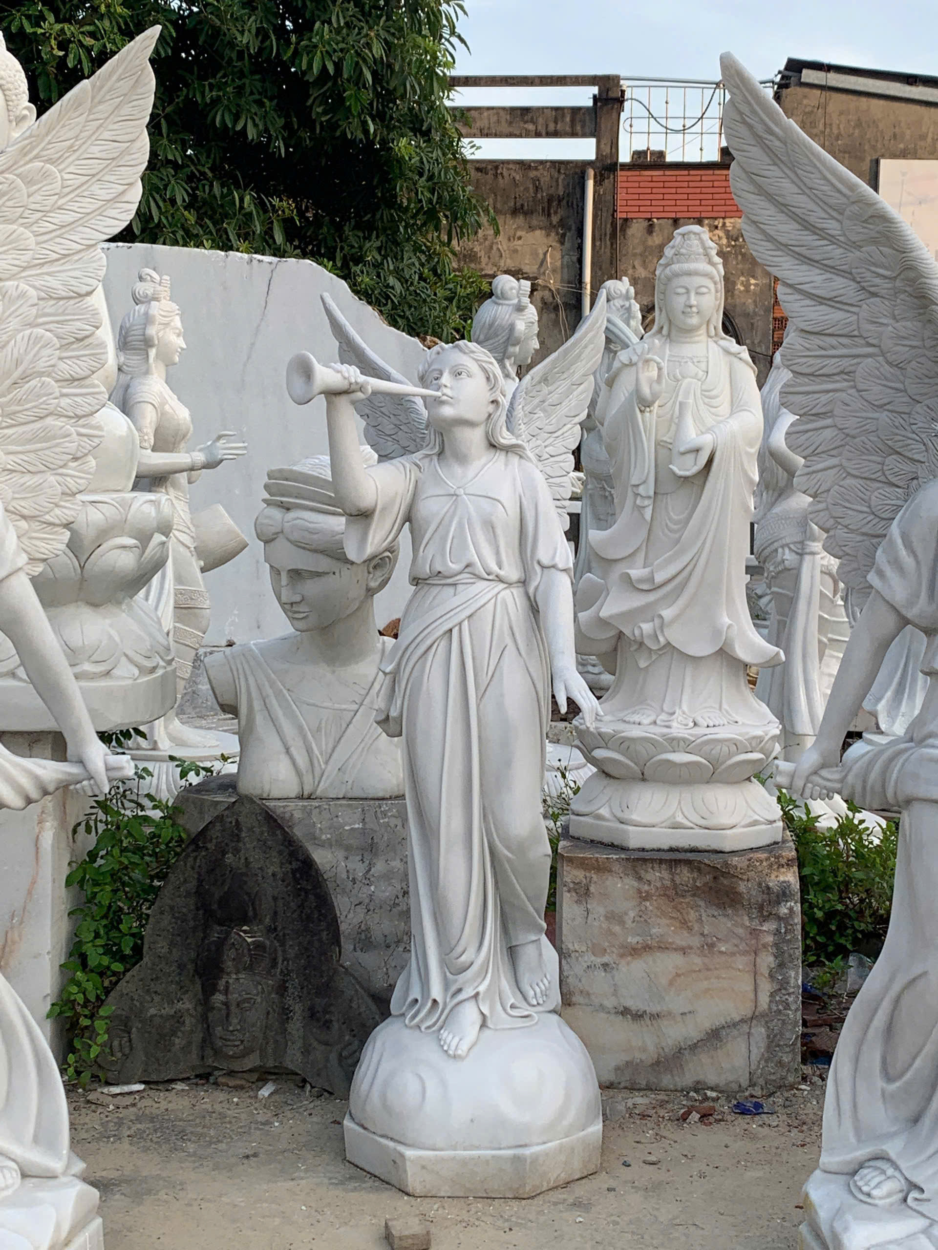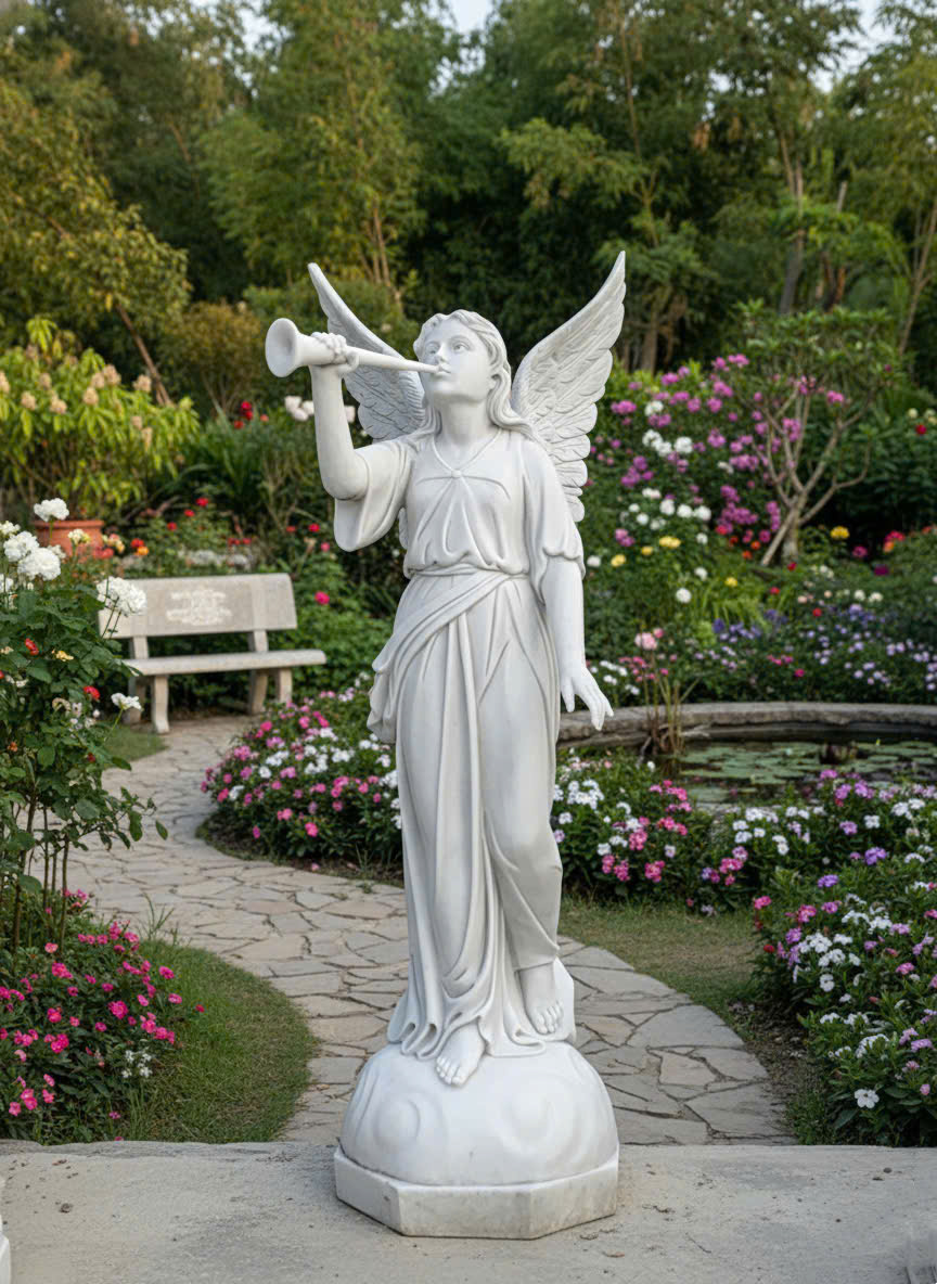 Tượng thiên thần thổi loa bằng đá trắng (thường là cẩm thạch trắng) mang ý nghĩa cao đẹp về việc truyền tin vui, sứ giả bình an và tôn vinh cái đẹp. Tượng biểu trưng cho sự kết nối giữa trời và đất, mang lại niềm hy vọng, sự bảo vệ và tạo không gian thanh thản, thiêng liêng cho không gian đặt tượng.