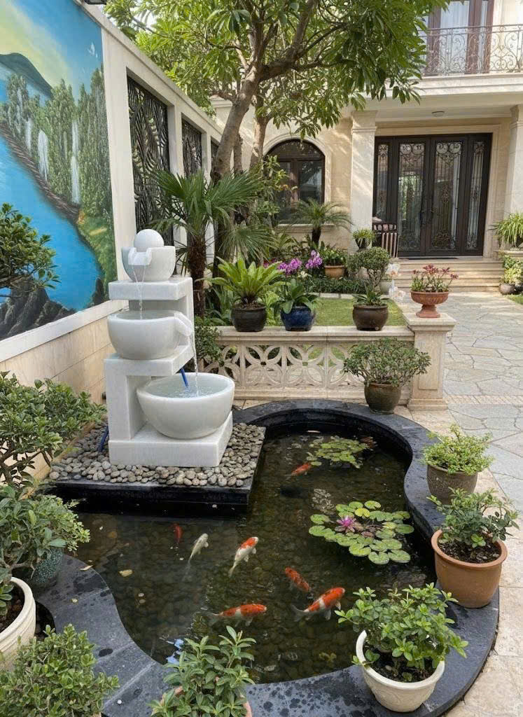 Ít ai để ý rằng đài phun nước còn đóng vai trò như một máy điều hòa nhiệt độ cho sân vườn. Nước chuyển động liên tục giúp tăng độ ẩm tự nhiên, làm giảm nhiệt độ xung quanh từ 2-3°C trong những ngày hè oi ả. Sự kết hợp giữa đá cẩm thạch tích nhiệt thấp và làn hơi nước mát lạnh tạo ra luồng sinh khí dễ chịu lan tỏa khắp hiên nhà.