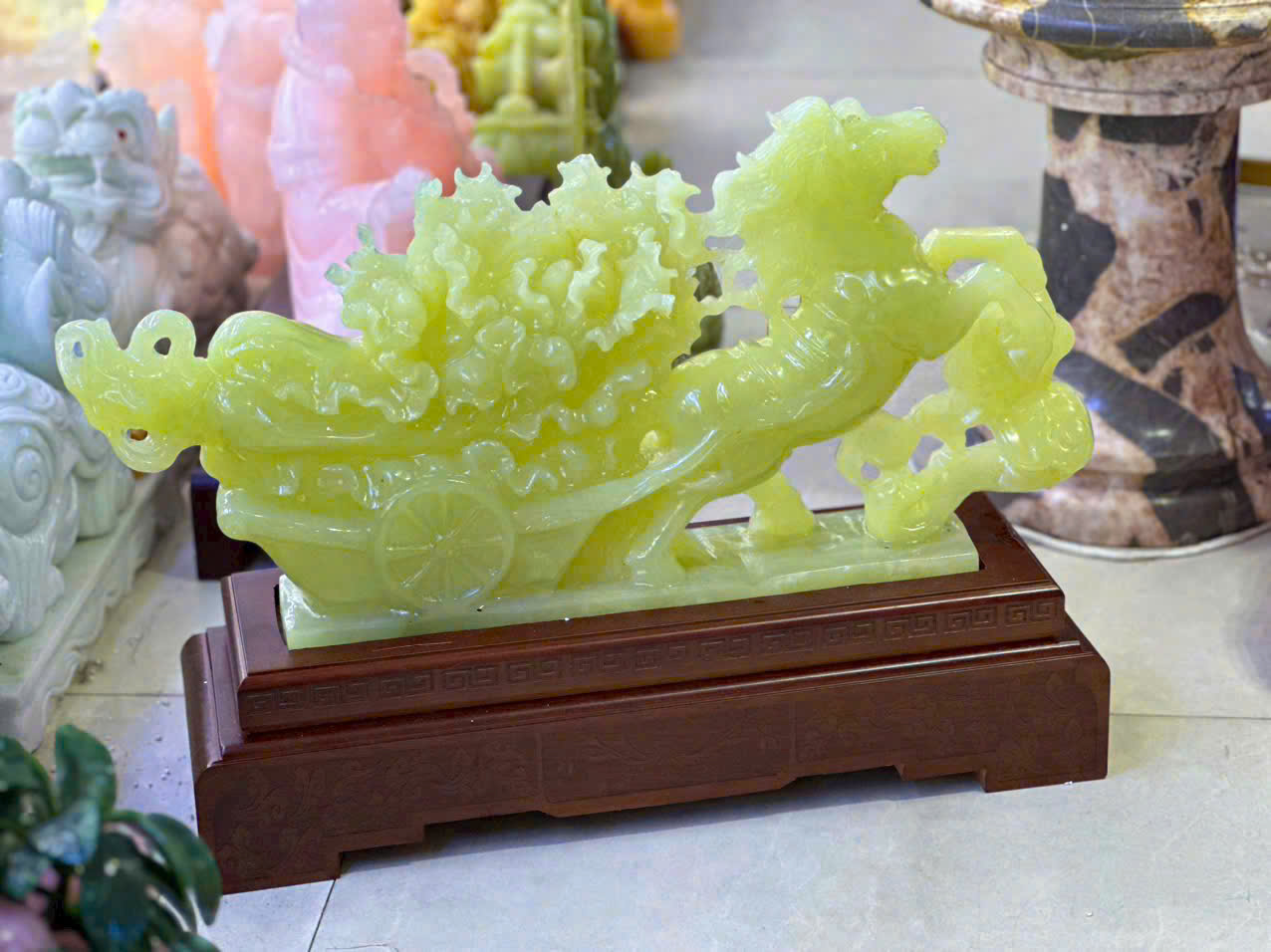 Hình dáng: Hình tượng ngựa kéo xe chở bắp cải – biểu tượng của tài lộc, sức mạnh và sự thăng tiến.