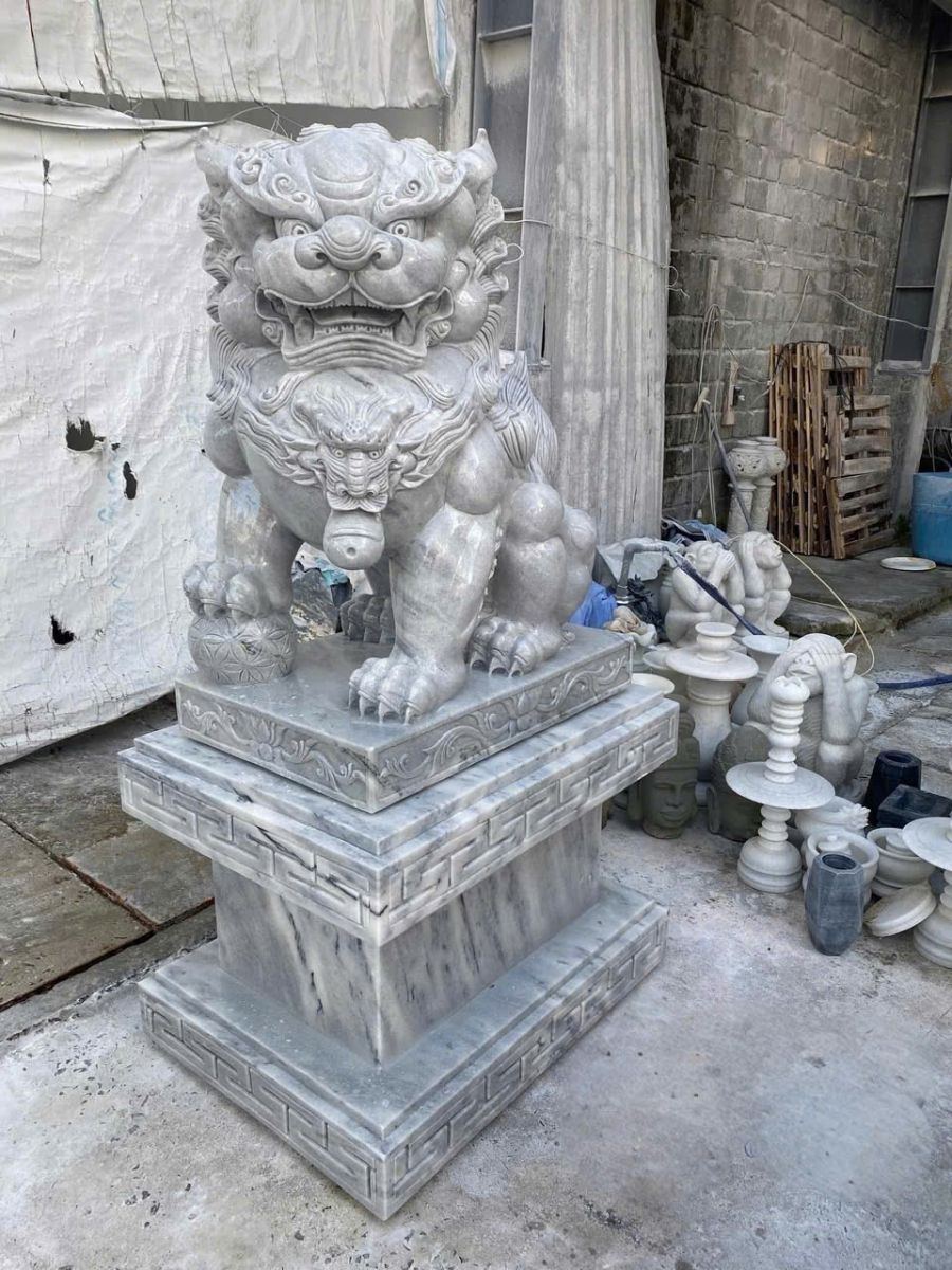 - Chạm khắc thủ công tinh xảo: Từng chi tiết từ ánh mắt, bờm, móng vuốt đến hoa văn bệ đá đều sắc nét, sống động.