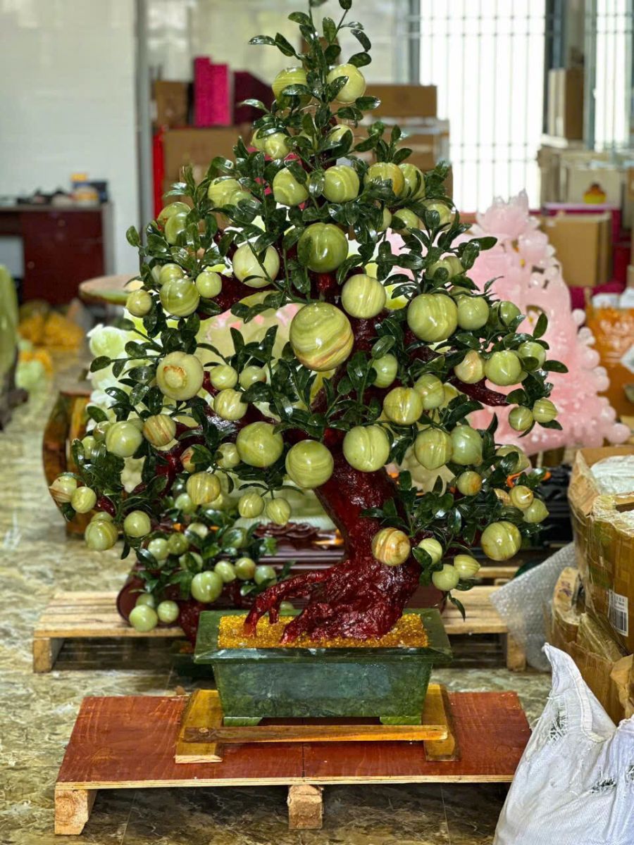 Quả được làm từ đá ngọc hoàng long, chậu cây và lá cây được là từ đá cẩm thạch. Nên chiêu tài lộc và mang đến gia đình hạnh phúc viên mãn