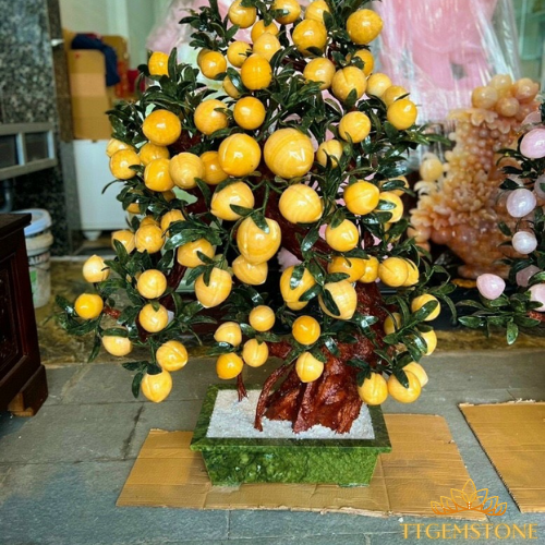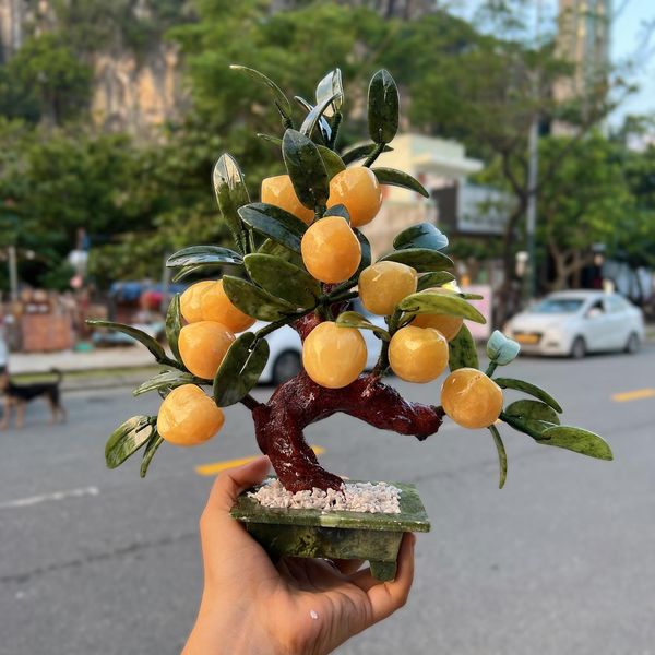 Cây đào tiên ngọc hoàng long, lá ngọc xanh quý hiếm mang ý nghĩa phong thủy tốt: thu hút tài lộc, biểu tượng của sự sung túc, tăng vận may trong kinh doanh, buôn bán. Quả được làm từ đá ngọc hoàng long, chậu cây và lá cây được là từ đá cẩm thạch. Nên chiêu tài lộc và mang đến gia đình hạnh phúc viên mãn.