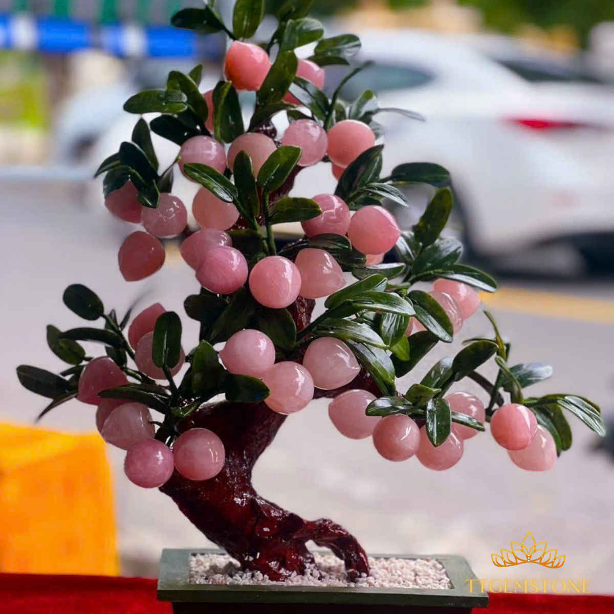 Chậu cây thạch anh hồng được làm bằng đá thạch anh hồng giúp tôn lên vẻ đẹp của cây. Đặc biệt, phần gốc cây được đắp bằng đá thạch anh vàng tượng trưng cho tài lộc, giúp tăng cường năng lượng dương và mang lại may mắn cho gia chủ.