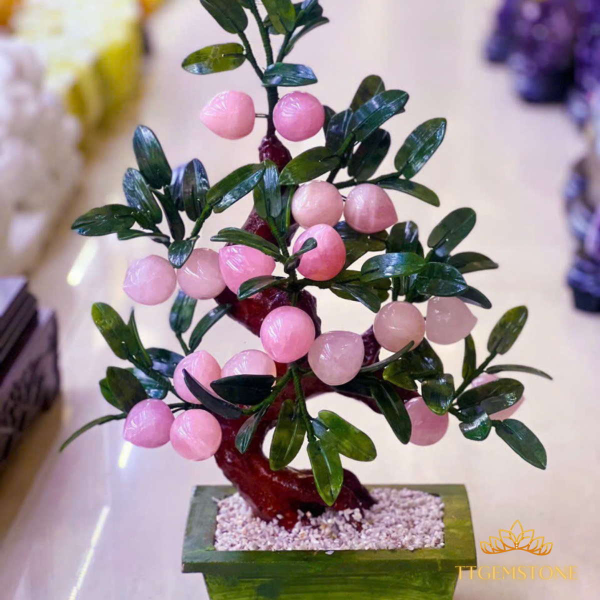 Cây đào tiên đá thạch anh hồng là biểu tượng của sự trường thọ, hạnh phúc và viên mãn. Trong những ngày cuối năm, nếu gia chủ trưng cây đào tiên đá thạch anh, nó sẽ giúp thu hút nhiều quả ngọt và mang lại sự êm ấm, hạnh phúc và trường thọ cho gia đình trong cả năm.
