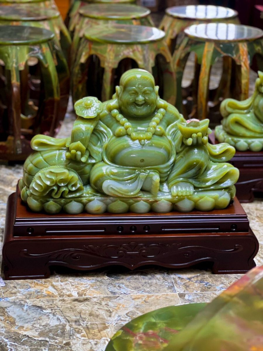 Tượng Phật Di Lặc là một hình tượng quen thuộc với nụ cười rộng, gương mặt hiền hòa và dáng vẻ thư thái. Khi được chế tác từ đá ngọc onyx xanh, tượng mang lại những giá trị cảm xúc: