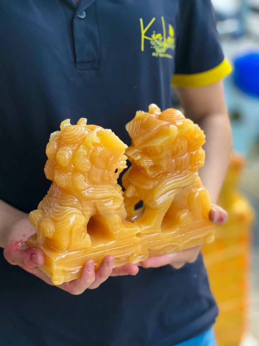 Lựa chọn nguyên liệu: Đá Ngọc Hoàng Long được chọn lựa kỹ càng từ những mỏ đá chất lượng cao, đảm bảo màu sắc đẹp, độ trong suốt cao và không có tạp chất. Các nghệ nhân điêu khắc sử dụng bàn tay tài hoa và kinh nghiệm lâu năm của mình để tạo nên những chi tiết tinh xảo trên Tượng Kỳ Lân bằng đá ngọc hoàng long, từ đường nét đến họa tiết trang trí. Sau khi điêu khắc, Tượng Kỳ Lân sẽ được đánh bóng và lau chùi sạch sẽ, đảm bảo đạt được độ sáng bóng và hoàn hảo nhất.