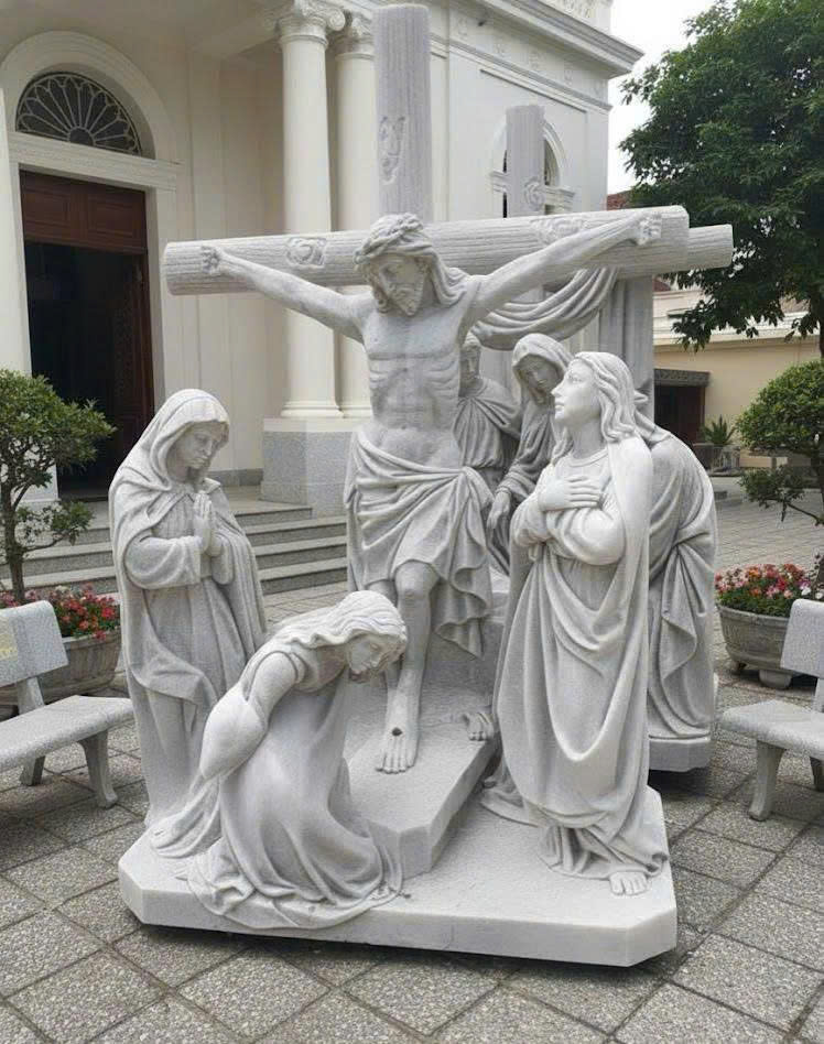 Hướng đặt tượng: Nên đặt tượng hướng về phía có ánh sáng tự nhiên tốt (hướng Đông hoặc hướng Nam). Ánh sáng mặt trời buổi sáng chiếu lên đá trắng sẽ tạo ra hiệu ứng hào quang tự nhiên, làm tăng thêm sự linh thiêng cho Bộ Cảnh Chịu Nạn.
