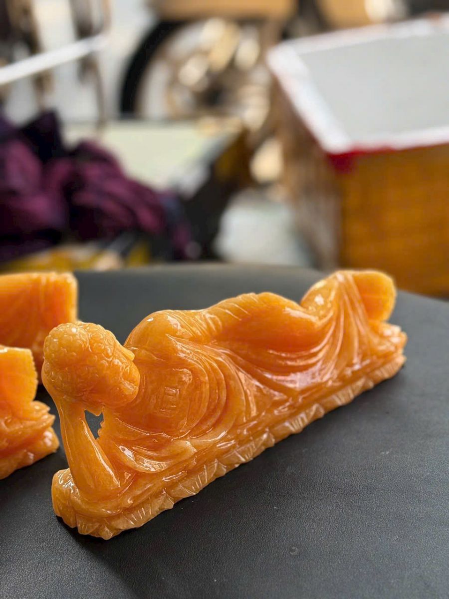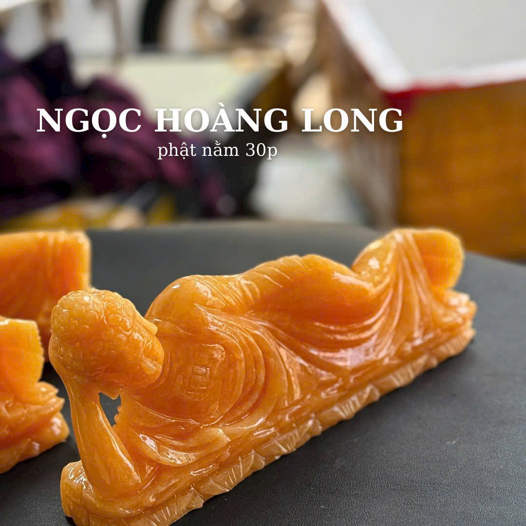 Tượng Phật A Di Đà dáng nằm bằng đá ngọc hoàng long tự nhiên là tác phẩm điêu khắc tinh xảo, thể hiện hình ảnh Đức Phật trong tư thế nằm an nhiên, thanh tịnh và giải thoát. Từng đường nét mềm mại, biểu cảm hiền hòa cùng sắc vàng ấm của đá ngọc hoàng long tạo nên một kiệt tác mang vẻ đẹp sang trọng, trang nghiêm và tràn đầy năng lượng tích cực.