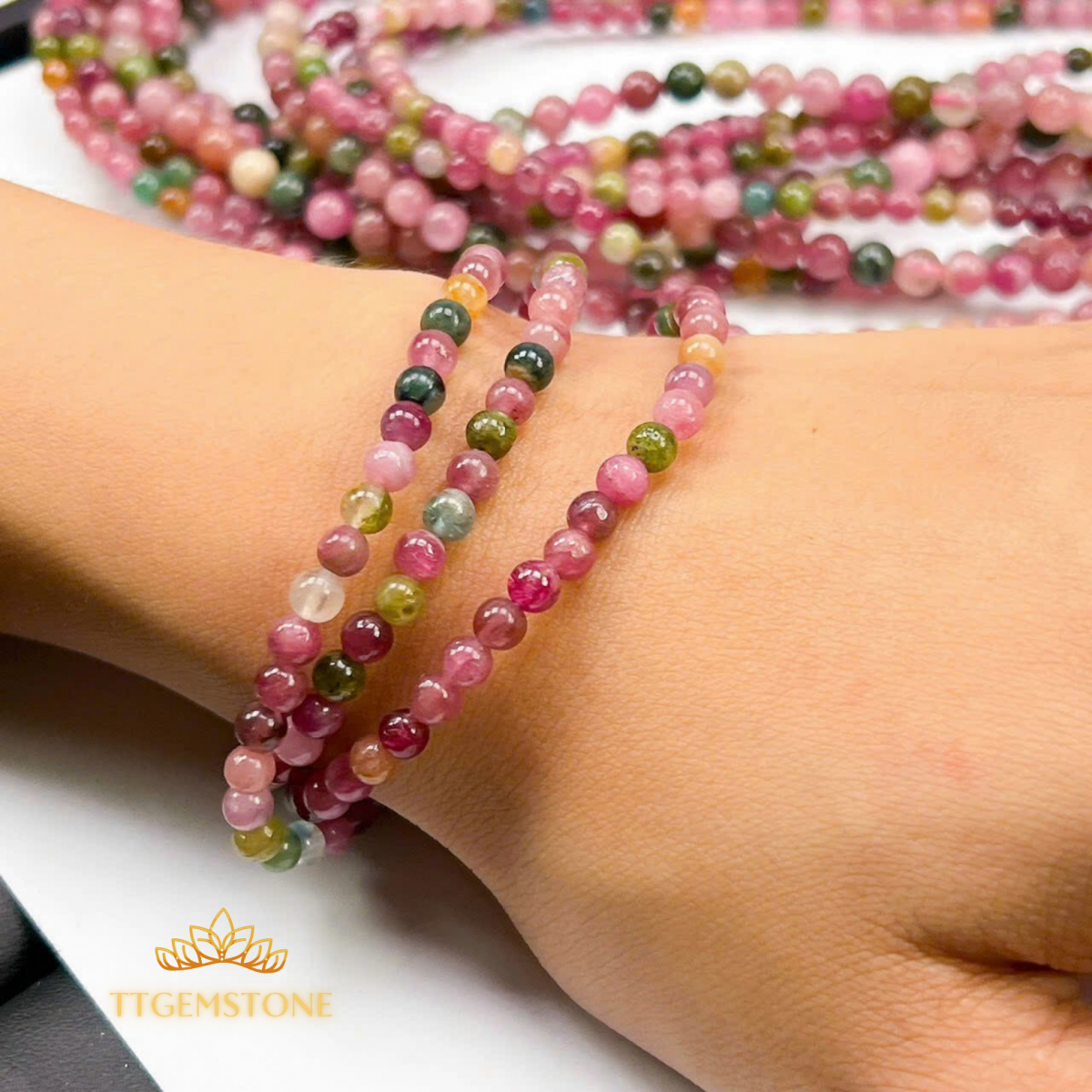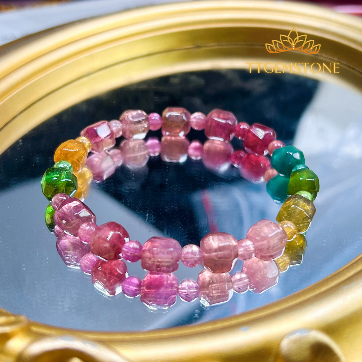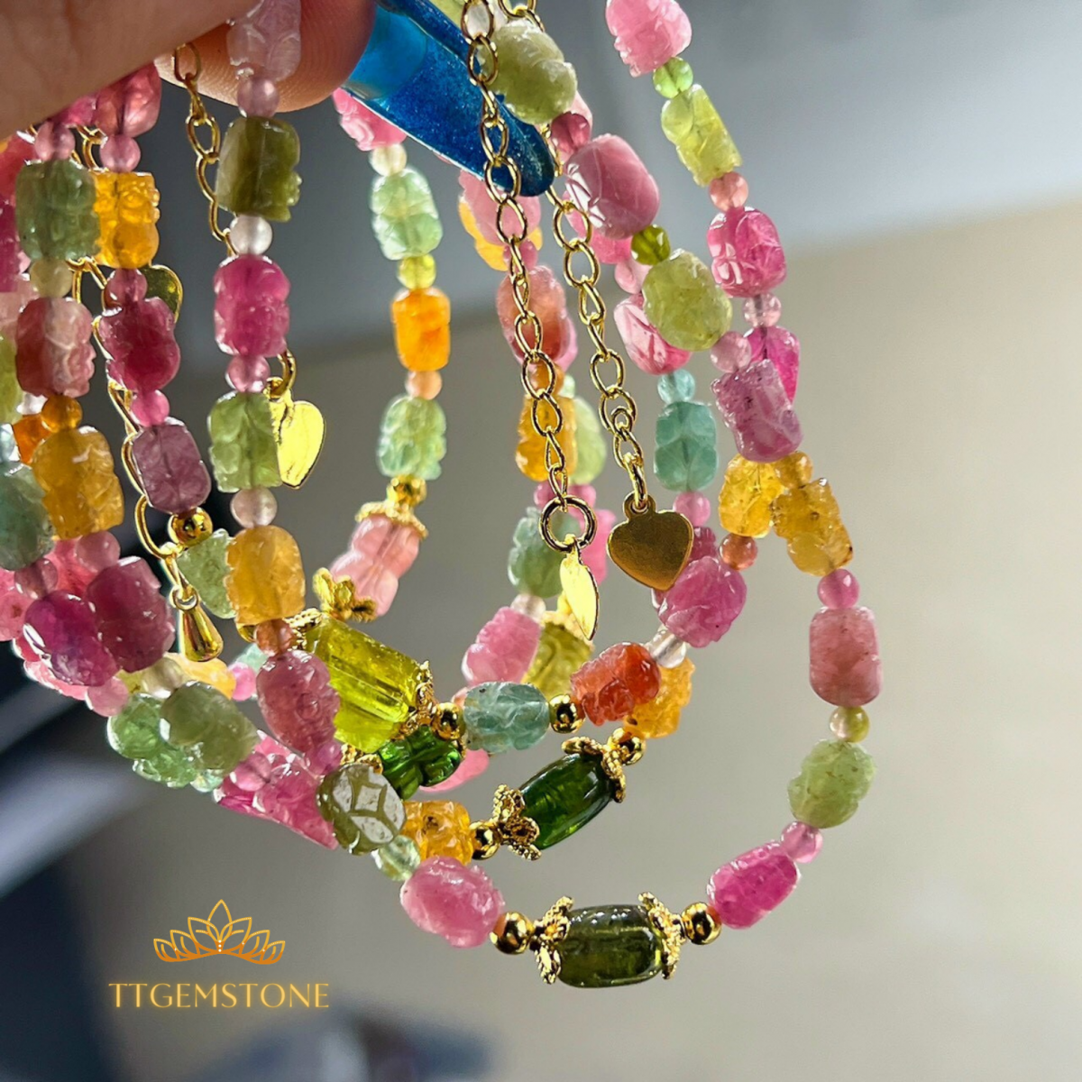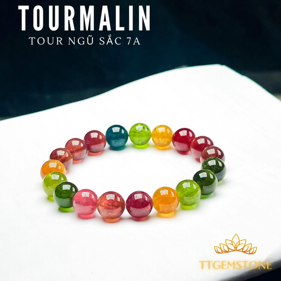 Lắc tay đá Tourmaline mang đến vẻ đẹp huyền bí và lấp lánh với sự đa dạng màu sắc, tạo nên một bức tranh sống động trong thiết kế khi các viên đá được sắp xếp theo nhiều kiểu cách khác nhau.